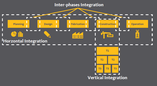 건설 산업이라는 것이 제조업과는 다르게 그 기반이 '프로젝트' project에서 발생합니다. 프로젝트는 일시적 temporary 성격과 개별성/특수성 bespoke을 동시에 지니고 있습니다. 그렇기 때문에 건설업은 제조업과는 다르게 Planning, Design, Fabrication의 사업분야를 건설사가 보유하고 있기에는 조금 벅찹니다. 그렇기 때문에 Planning/Design은 건축설계/기본설계를 주로 하는 건축사무소, 설계사무소로, Fabrication은 제조업 기반의 전문 업체들에게로 분산되어 있습니다. 그리고 이러한 분산된 사업들을 프로젝트라는 이름 아래에 모여 최종적으로 Operation을 전문으로 하는 발주 자에게 handover 되죠.