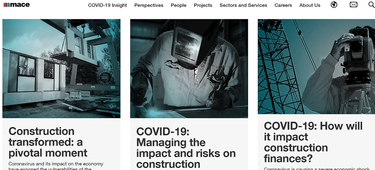 Mace는 컨설팅 서비스를 제공할 인력을 보유하고 있습니다. COVID-19에 대항하여 살아남기 바쁜 건설사들은 이 위기를 어떻게 극복해야 할지 정신이 없을 텐데요. 건설사인 이들의 COVID-19에 대한 insight들은 그 홈페이지에서 찾아볼 수 있습니다.