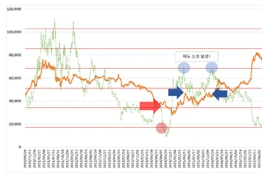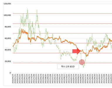 먼저, 괴리율 20%는 보통주와 동일하게 2014년 9월 3일에 최초로 나타납니다. 이 때 가격은 37,350원입니다. 그리고 이후 보통주와 우선주의 가격차이가 거의 없다시피 하며 최소 수치인 11%의 괴리율로 접근합니다. 이때의 투자 경험이 아직도 생생합니다. 보통주 39,600원 (우선주 35,550원)이었습니다. 그후, 보통주가 기막히게 반등하면서 괴리율은 가파르게 상승합니다. 유가 상승으로 인한 실적의 변화, 어닝 서프라이즈가 주가상승을 이끌었습니다. 이후 80%의 괴리율 시점은 2015년 4월 8일 (40,100원), 그리고 2016년 1월 15일 (43,900원) 두차례에 걸쳐 나타납니다: