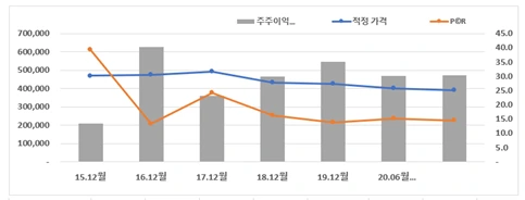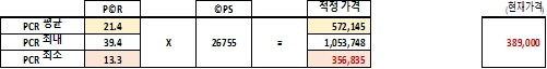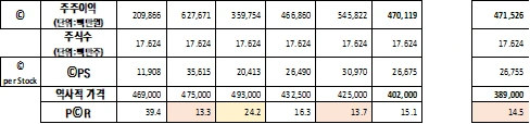 2020년 반기 기준으로 구했던 주주이익은 4701억 원이었고, 2020년 3분기 기준으로 새로 구한 주주이익은 4715억으로, 약 14억 원이 증가하였습니다. 저는 2020년 반기에서 현재까지 이 회사의 주주인데, 1주당 주주이익은 26675원에서 26755원으로 80원 증가하였고, P©R은 14.5 수준으로 지난 분기 대비 작아졌습니다. P©R이 작아졌다는 말은 주주이익의 ‘증가분’ 대비 ‘주가’가 상승하지 않았다는 말이 됩니다. 2020년 반기 기준의 주가는 402,000원이었는데 현재는 389,000원입니다. 주주이익은 1주당 80원이 증가했는데 반해, 주가는 3.2% 하락했죠. 이와 같이, 과거 5 연간 역사적 가격과 P©R사이에는 어떤 관계가 있었을까요?
