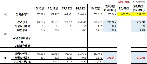 20년 반기 기준 옆에, 3분기의 누적 실적 4,232억 원을 기입하고, 2019년 4분기의 실적인 1414억 원을 더해서, 5647억 원의 당기순이익을 고려합니다. 이 당기순이익은 2019년 4분기에서 2020년 3분기까지의 1년 실적입니다. 현재 사업보고서는 나오지 않았으므로, (b)와 (c)의 값들은 20년 반기보고서의 내용에서 그대로 차용합니다. 그러면 주주이익은 아래와 같습니다: