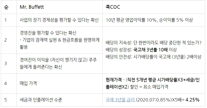 시가배당률로 주가-이익-배당을 확인하고, 현재에서 미래를 바라보며 예상 실적과 '배당금'을 산정합니다. 그러면 배당수익률을 구할 수 있습니다. 현재 주가 대비 '미래 배당금', 그 배당수익률과 과거의 시가배당률 간의 '괴리'에 투자합니다. 그리고 주주이익 관점에서 현재의 가격이 과거의 가격과 비교해서 어떤 관계가 있는지 확인할 수 있습니다. 그다음에는 안전마진을 고려해야죠. 아래와 같이 버핏 스타일을 난세에 맞게 적용합니다.