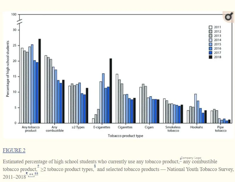 2. Cullen KA, Ambrose BK, Gentzke AS, Apelberg BJ, Jamal A, King BA. Notes from the field: use of electronic cigarettes and any tobacco product among middle and high school students - United States, 2011-2018. MMWR Morb Mortal Wkly Rep 2018;67:1276-1277.