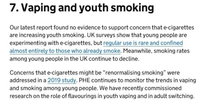 UK health security agency가 영국내 Vaping과 청소년 흡연율에 관해 내린 결론은 아래와 같다. 영국 청소년들이 Vaping을 경험해 보긴 하지만 이것이 규칙적 사용자로 진행하는 경우는 거의 없으며, 대부분은 궐련을 흡연했던 학생들이 Vaping도 규칙적으로 사용한다는 것이다. 결론적으로 영국 청소년 흡연율은 Vaping도입 이후 감소추세이다.