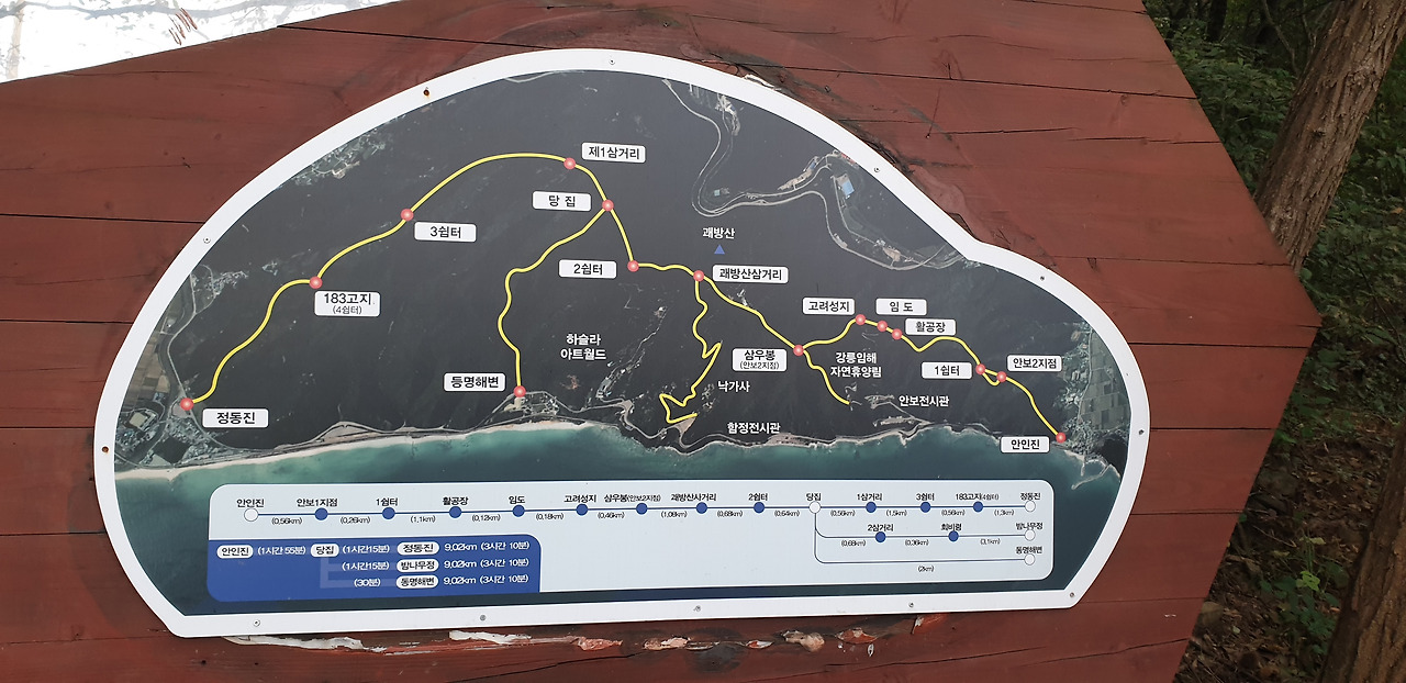 안인진에서 345m 괘방산과 183 고지를 거쳐 정동진까지 9.1km의 산과 바다를 동시에 조망할 수 있는 트레킹 코스다.