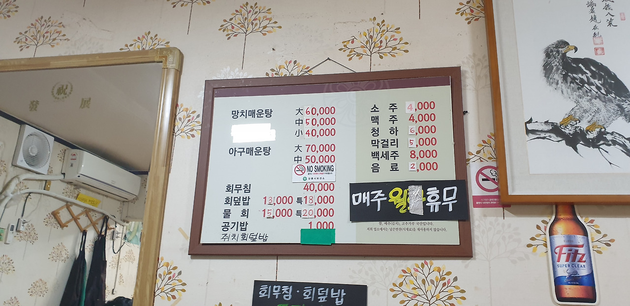4명 성인 남자가 소자리 망치매운탕 하나로 충분할 정도고 일 인분인 물회와 회무침도 양이 장난 아니다.