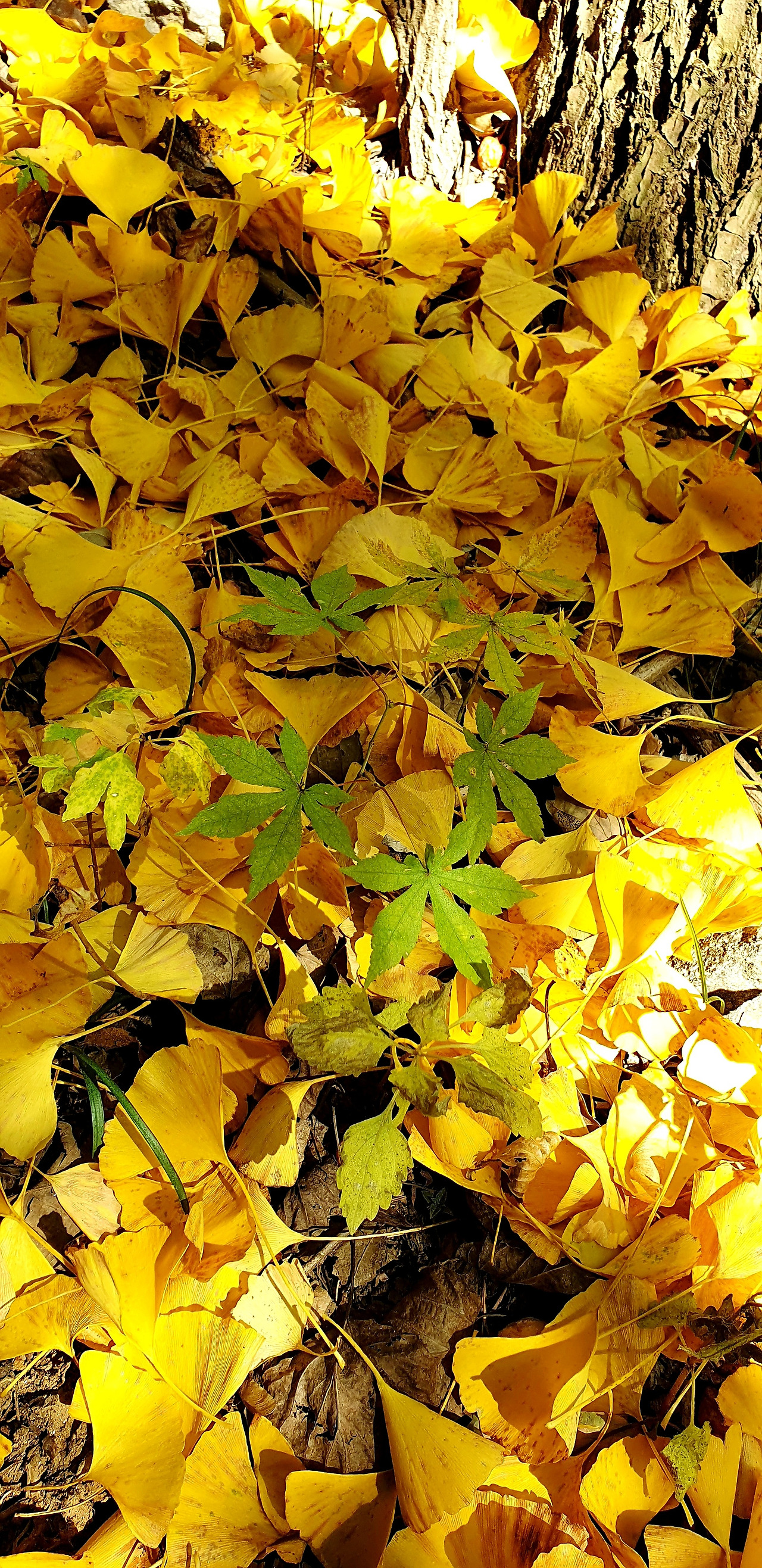 하산길에 바닥에 쌓인 은행잎 무더기에서 Y대장이 무언갈 폰에 담고 있다.