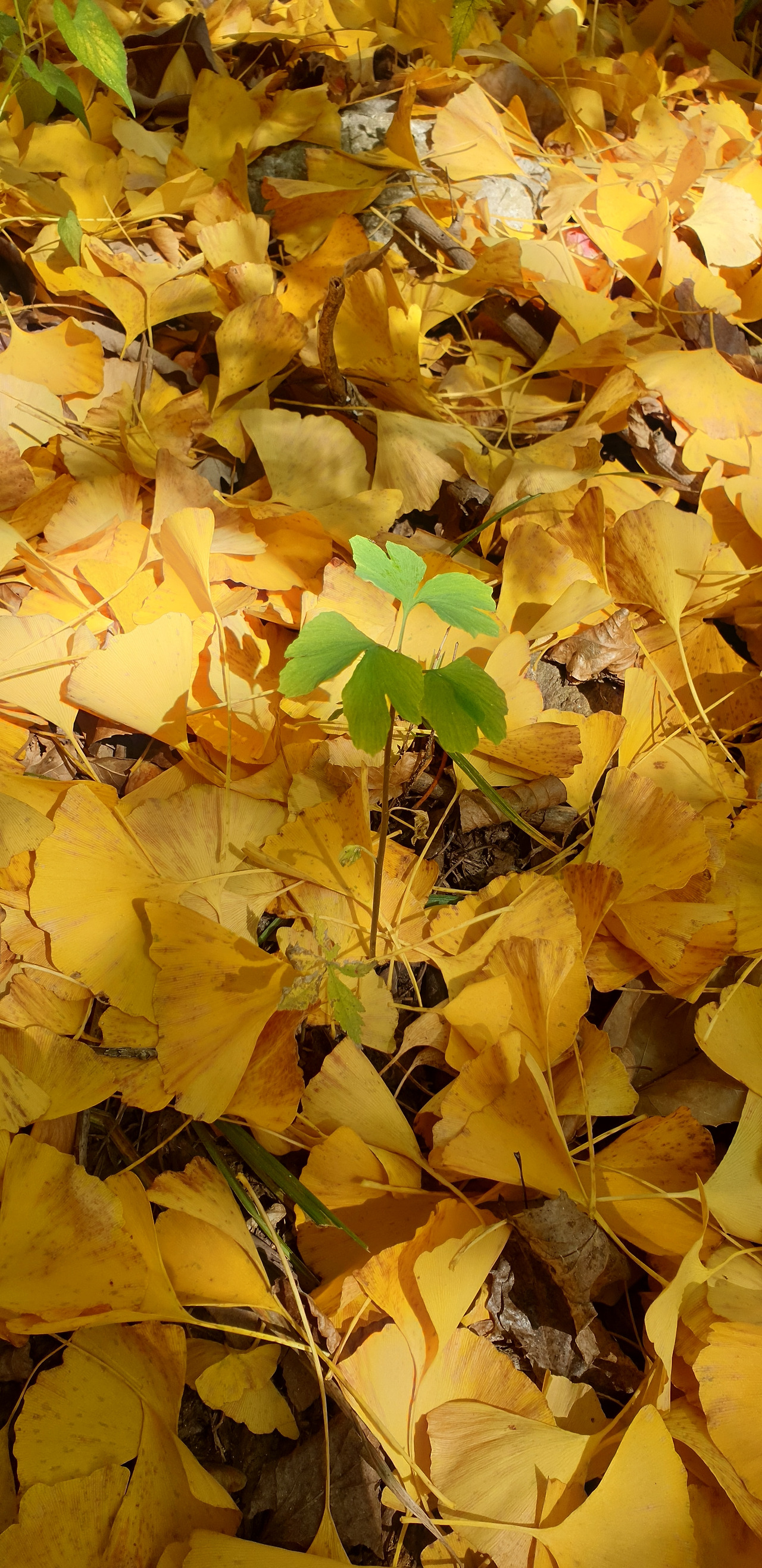 수북한 은행잎 아래 은행알 하나가 싹을 틔운 것일까?