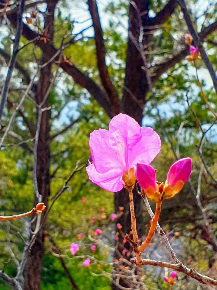팔꿈치로 악수를 대신하고 심지어 엘리베이터 버튼도 팔꿈치로 누르는 광경도 눈에 띈다. 외계인도, 핵전쟁도, 지진/해일 같은 자연재해도 아니고 눈에 보이지도 않는 바이러스 따위가 세상을 이렇게 바꿔 놓을 줄이야. 갑갑증을 못 견뎌 지난 주말 조심스레 찾은 은석산엔 노란 개나리, 생강나무 꽃과 함께 팝콘이 터지기 직전인 진달래가 여느 해처럼 피어 있었다.
