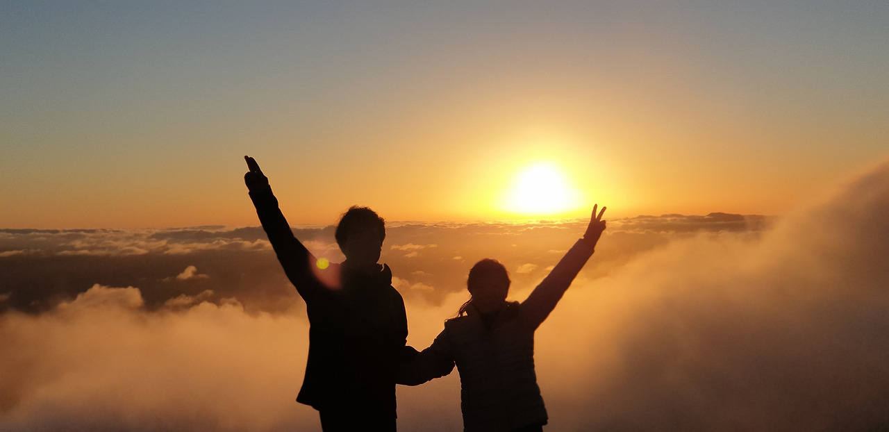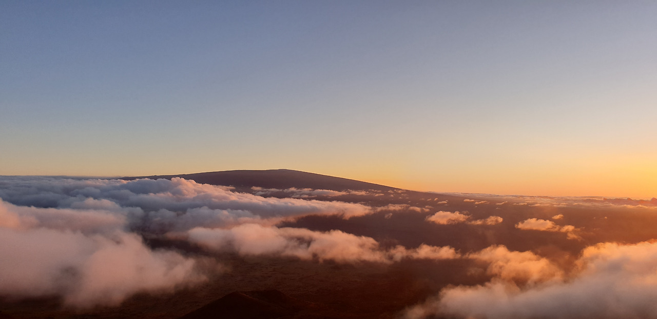 오후 3시를 조금 넘겨 빅아일랜드 일정의 하이라이트인 마우나케아(Mauna Kea) 천문대로 향했다. 17시 전에는 도착해야 고도 적응을 마치고 구름 위 일몰 명소로 올라갈 수 있다. 가는 길 내내 비와 안개가 자욱해, 일몰은 틀렸구나 싶었다. 그런데 해발 2,800미터인 마우나케아 비지터센터에 접어들자 우측은 구름, 좌측은 햇살로 대기가 둘로 갈리는 믿기 힘든 풍광이 펼쳐진다. 비지터센터에서 천문대가 있는 4,207m 정상까지 올라가려면 4륜구동차가 필요하다. 욕심이 났지만 아내의 건강을 고려해 기꺼이 포기했다. 2,800미터도 이미 구름 위인지라, 그위로 떨어지는 일몰, 그리고 황금빛 햇살에 물든 주변의 산군들을 바라보는 조망만으로도 충분히 압도적이다.