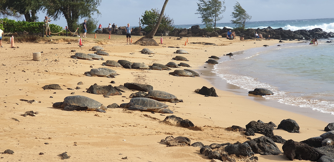 골프팀을 제외한 11명이 이웃 섬인 카우아이섬 1일 투어에 나섰다. 카우아이섬은 쥐라기공원, 인디아나 존스, 킹콩, 캐리비안의 해적 등 영화 촬영지로 유명한 곳으로 원시우림과 장대한 케니언 등 압도적 자연경관에 대한 기대가 가장 컸던 곳. 하와이는 섬과 섬 간의 이동이 비행기로만 가능한데, 밤새 호텔 창문이 덜컹거려 잠들기 어려울 정도의 강풍이 불어 비행기가 뜰까 잠을 설쳤다. 다행히 카우아이에 무사히 도착. 문제는 그다음부터였다. 여행의 하이라이트인 해발 1,220미터의 칼랄라우 전망대와 와이메아 캐니언 두 곳 모두가 구름이 자욱해 아무것도 보이지 않았다. 한국의 산악인들이 소위 '곰탕'이라고 부르는 상황. 다행히, 포이푸 비치에서 엄청난 거북이 떼와 물범이 실망한 우리 일행을 위로해 주었다.