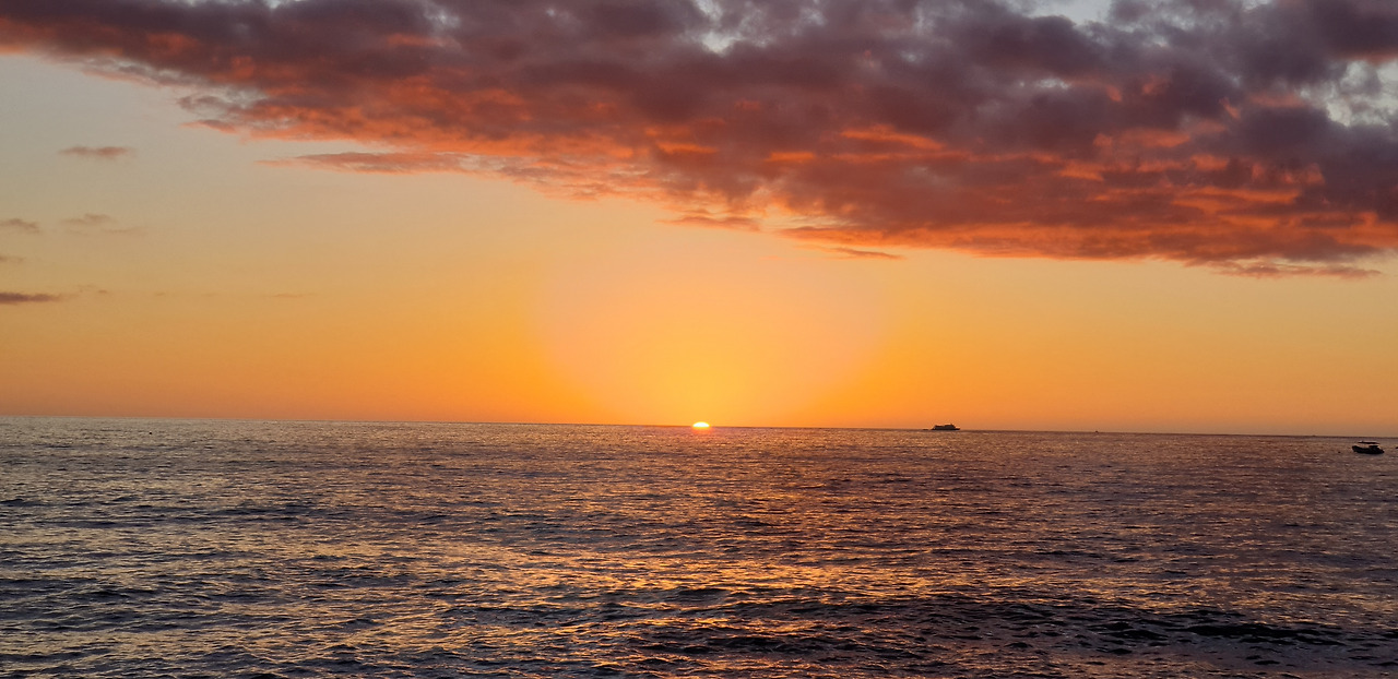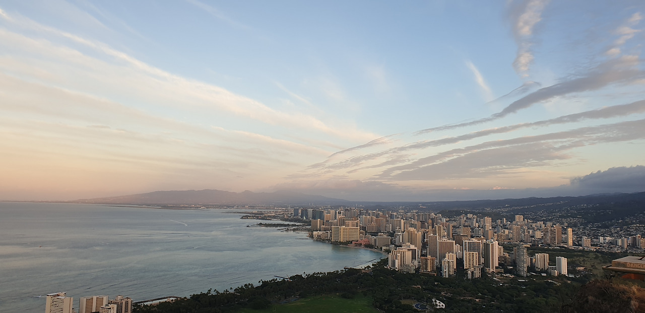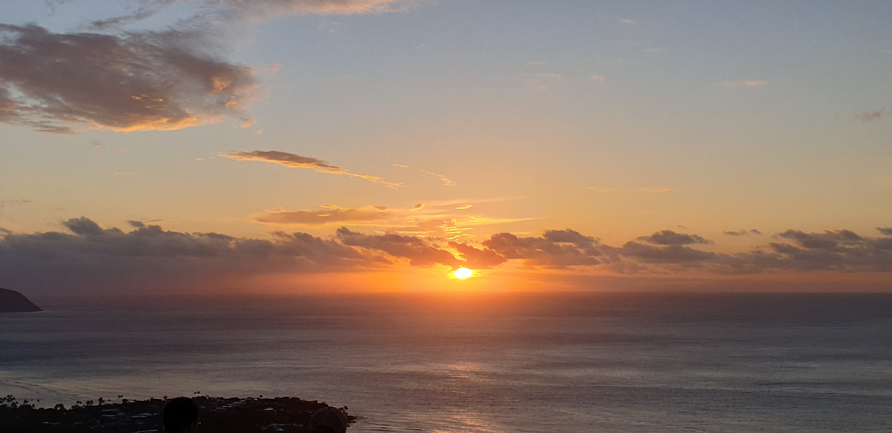 수유리 출신의 우리 부부와 수유시장입구의 유명 개원의사인 조원장 부부가 의기투합, 다이몬드 헤드 일출 트레일을 나섰다. 첫날부터 이국에서의 새벽이동인지라 걱정했는데 명불허전, 우버는 생각보다 정확하고 편리했다. 새벽어둠을 뚫고 한 시간여 언덕을 올라 정상에 섰다. 바다와 구름사이로 장엄한 해가 떠올랐다. 건너편으로 와이키키 해변과 리조트군이 한눈에 펼쳐진다.
