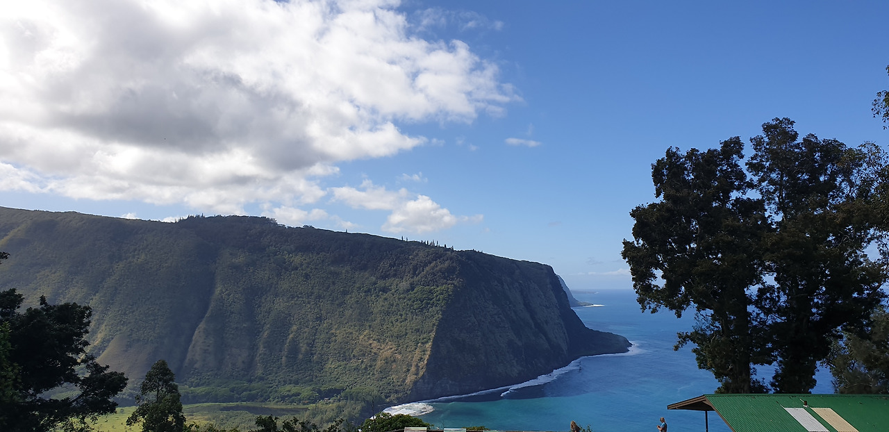 와이피오 협곡 look out으로 가는 도중 빅아일랜드 지역 거의 유일한 드라이브 인 식당인 Tex drive-in에서 말라사다 도넛을 맛보았다. 하늘과 바다, 구름과 언덕이 환상적으로 어우러진 와이피오 협곡의 시원한 풍경을 정신없이 사진에 담았다. 내리막으로 바다까지 내려가 보고 싶었으나 시간이 아쉬웠다. 귀갓길에 Mud lane을 드라이빙하며 아쉬운 마음을 달랬다. 현지인들만 안다는 Mud lane은 황토와는 아무 관련이 없는, 아름드리나무로 둘러싸인 드라이빙 명소였다.