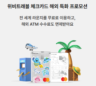 연회비 비싼 프리미엄 카드가 없는지라 공항라운지 이용은 강 건너 불구경이었다. 이번엔 우리은행 위비트래블 카드라는 체크카드를 가족카드도 함께 만들어서 부부동반 라운지 입장에 성공했다. 연회비가 없고 해외결제 수수료 할인, 해외에서 ATM 수수료 면제 등 혜택도 좋지만, 발급 후 30만 원을 사용하면 전 세계 공항라운지 이용권을 연 2회 받을 수 있다.