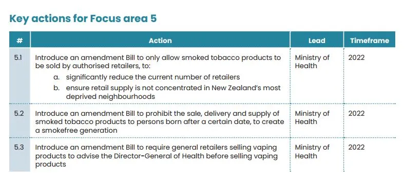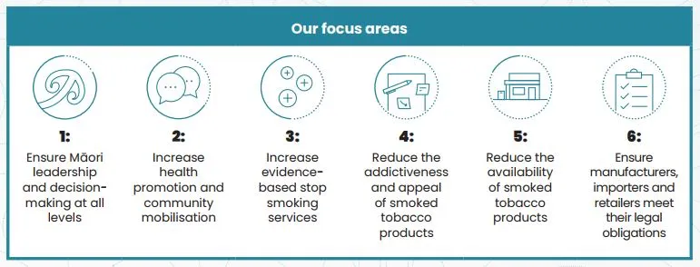 뉴질랜드 정부의 담배종결전의 핵심은 아래 6가지 집중 분야(focus areas)에서 확인할 수 있다.