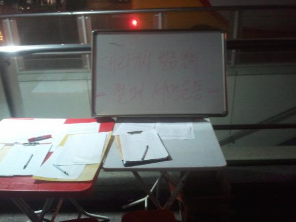 우선 아는 식당으로 가서 테이블을 가져와야 합니다. 식당 주인 아주머님, 반가이 맞으며 테이블과 의자, 게다가 화이트보드까지 꺼내서 줍니다. 아...정말 고맙습니다. 피케팅을 따로 해야하나, 대자보를 붙여야 하나 마음만 복잡했는데, 건네주시는 화이트보드에 서명운동 제목도 쓰고 테이블에 걸어놓으니 그럴 듯 합니다.