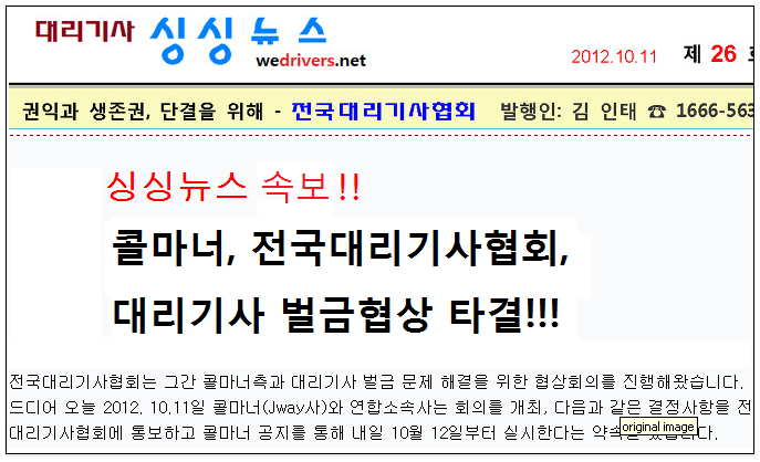 2012년 10월11일, 그간 전국대리기사협회와 콜마너와에 진행되오던 벌과금협상이 드디어 타결되면서 싱싱뉴스 26호는 곧바로 속보를 발행, 기쁜 소식을 대리기사세계에 급전했습니다.