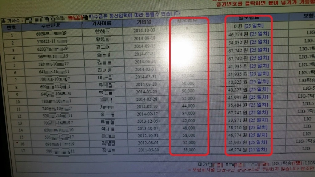 아래는(주)마중물대리 소속기사들의 보험료 상황입니다. 마중물 장경훈사장님의 허락을 받아 이렇게 자료 올립니다.(화면 캡처가 안되기에 모니터화면을 촬영한 것입니다.)