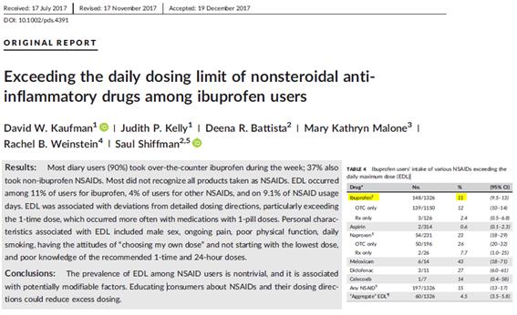 이 연구에는 1,326명의 사람들이 참여하였고, 일주일동안 매일 약품 일지를 작성하도록 하였습니다. 이들은 모두 이부프로펜(부루펜과 동일한 성분)을 복용하였고, 87%는 약국에서 처방전없이 약을 구입하였습니다. 그런데 오른쪽 표에서 보듯 이부프로펜 복용자의 11%가 일일 최대 허용량을 넘는 용량을 복용한 것으로 드러났습니다. 아스피린은 0.6%로 상대적으로 적었지만 나프록센(우리나라에선 낙센으로 알려져 있습니다)은 23%, 멜록시캄(상품명 모빅)은 43%, 디클로페낙(상품명 디낙스)은 27%가 일일 최대 허용량을 넘는 용량을 복용했다는 것입니다.