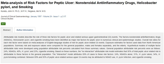 위 논문은 저명한 의학저널인 Lancet에 실린 연구결과로 25개의 연구논문을 바탕으로 진통소염제와 헬리코박터 균의 위, 십이지장 궤양 위험도에 관한 메타연구입니다. 이 논문에 따르면 헬리코박터균과 진통소염제가 독립적으로 궤양의 위험을 높일 수 있으며, 진통소염제 단독으로도 위험도를 5배 높인다고 보고하였습니다. 진통소염제 단독으로도 위험도를 5배나 올린다는 것은 대단한 겁니다. 특히나 Lancet에 실린 결과라는 것이 우리가 이 결과를 무시할 수 없는 이유입니다.