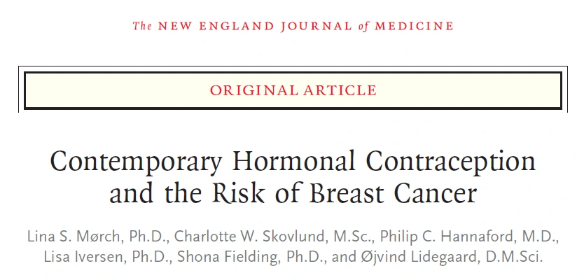 저명한 의학저널인 뉴 잉글랜드 저널 오브 메디슨 (New England Journal of Medicine)의2017년 12 월 7 일자 연구를 소개하면서 호르몬 피임제와 유방암의 연관성에 대해서 설명드리도록 하겠습니다. 연구팀은 덴마크에 거주하는 15 세에서 49 세의 여성인 총 1,797,932 명을 11년간 추적 관찰하였습니다. 관찰기간동안 유방암으로 진단 된 여성은 11,517 명이었습니다.
