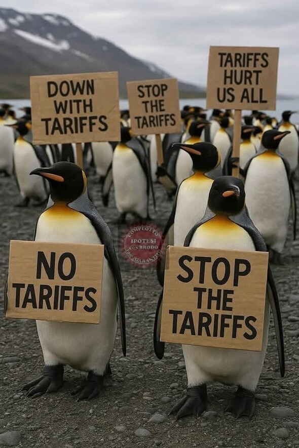 "부동산 개발업자 출신의 리얼리티 TV 스타가 대통령이 되어 글로벌 경제 질서를 틀어쥐고 사정없이 탈탈 흔들고, 재임 중 두 번 탄핵되고, 퇴임 후 기소되었다가 다시 당선되어서는 중국에다가 104% 관세를 때리고, 겸사겸사 펭귄도 세금내라고 윽박지른다"