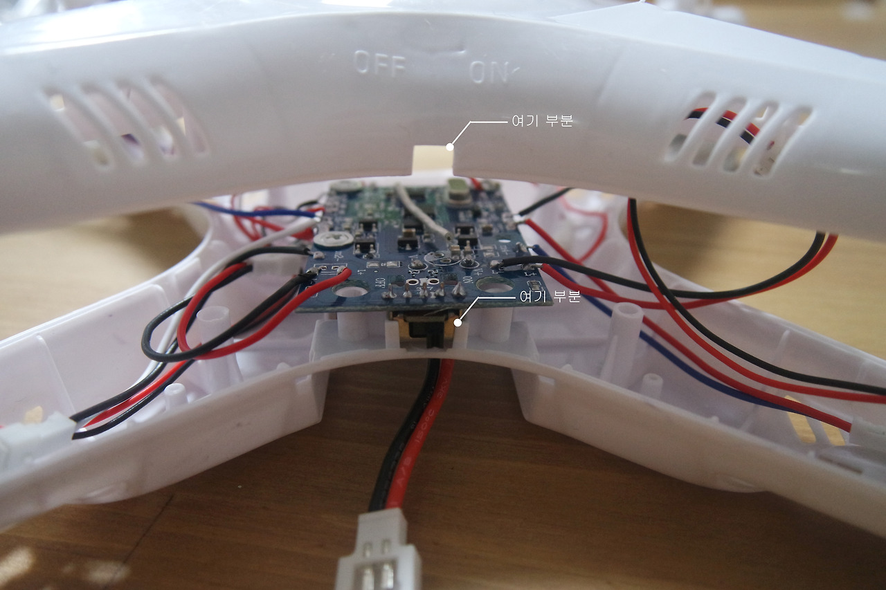 초등학생들이 실수하는 다른 하나는 랜딩 스키드입니다. 가끔 어떤 초등학생들은 랜딩 스키드를 위아래로 결합하는 학생이 있습니다. 사람의 다리를 생각하시면 됩니다. 사람의 다리와 드론의 랜딩 스키드가 같다고 생각하시면 위치를 너무나도 쉽게 결합할 수 있습니다.