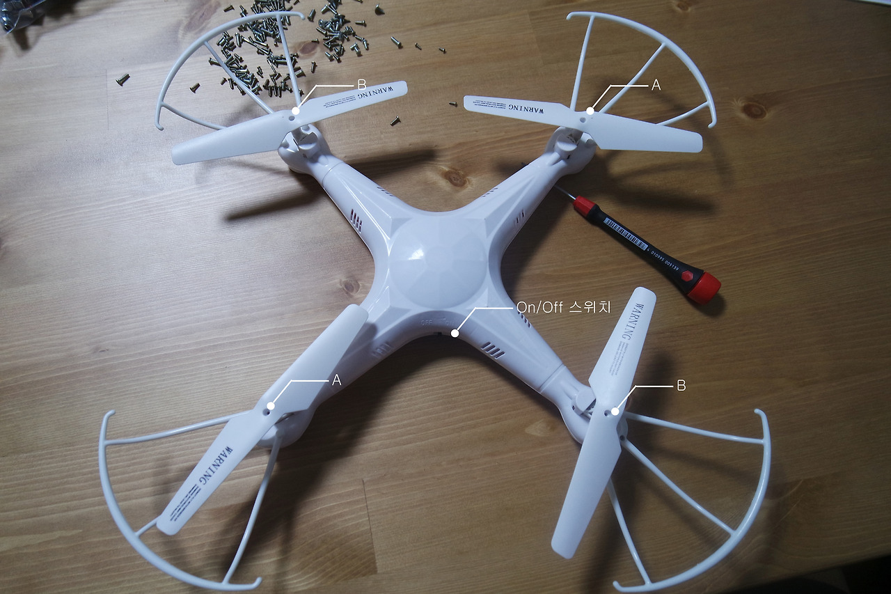 초등학생들이 실수하는 2가지가 있습니다. 그중 하나는 프로펠러입니다. 프로펠러는 모터에 맞게 각자 위치가 정해져 있습니다. 프로펠러는 모두 같은 방향으로 회전하지 않습니다. 따라서 프로펠러의 방향이 2종류로 나뉩니다. 모터 또한 같습니다. 시계방향인 CW(ClockWise)와 반시계 방향인 CCW(Counter ClockWise)가 있습니다. CW 모터에는 CW 프로펠러를 장착해야 합니다. 반대로 될 경우 양력이 발생하지 않아 드론이 상승하지 않습니다. 프로펠러의 중심 부분 혹은 뒷부분에 표시가 되어있기도 하지만 프로펠러가 기울어진 방향을 보면 알 수 있고 대각선끼리 같다는 것을 알 수 있습니다. 드론에 대해 모르는 분들은 조립, 제작하는 데에 실수할 수 있는 부분입니다. A와 B로 나누어놔서 걱정할 건 없지만 초등학생들은 무작정 결합해서 날지 않는다고 울기도 합니다. 다음에 드론 프로펠러, ESC에 대해 글 쓸 때 자세하게 말씀드리겠습니다.