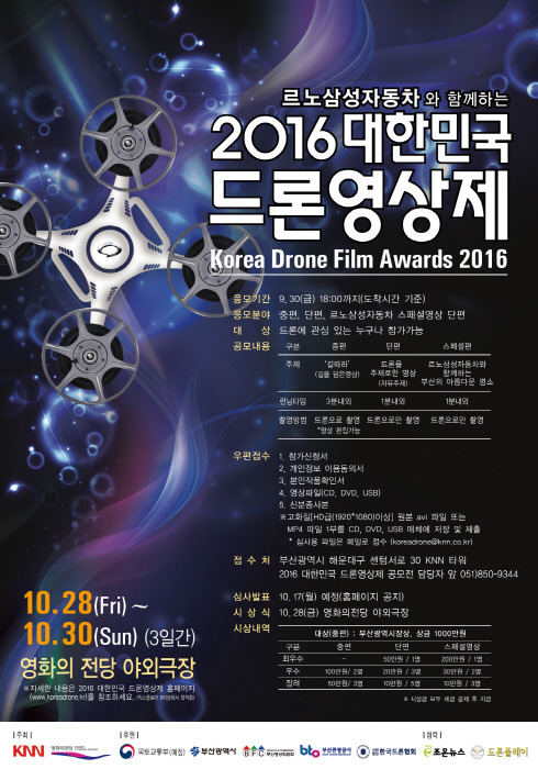 부산 영화의 전당 야외극당에서 드론으로만 촬영한 영상만을 대상으로 한 2016 대한민국 드론 영상제 시상식이 열렸습니다. 응모기간은 9월 30일까지 였고 모집 분야는 자유주제의 1분 내외인 단편과 '길 따라' (길을 담은 영상)이라는 주제의 3분 내외 중편이었습니다. 저희는 중편 부문에 출품했습니다.