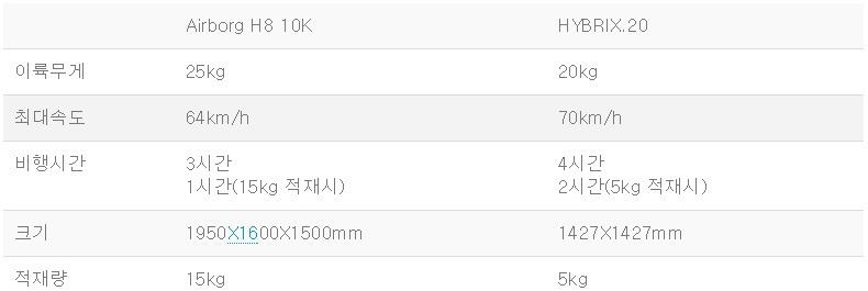 하이브릭스.20은 하이브리드 엔진을 채택해 5kg을 적재하고도 최소 1시간에서 최대 2시간까지 비행할 수 있다고 합니다.