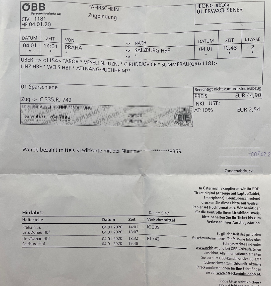 기차표는 한국에서 미리 예매하고 표도 뽑아서 왔다 [프라하-잘츠부르크] 구간 'OBB' 기차표를 구매했다