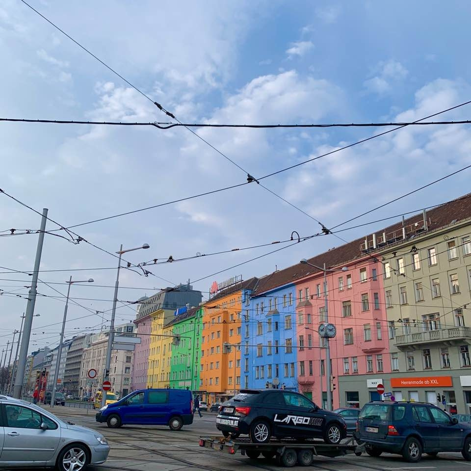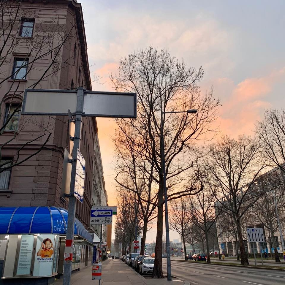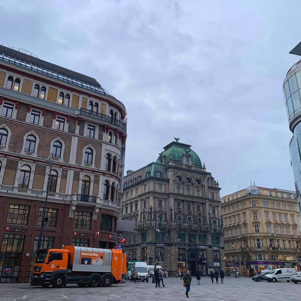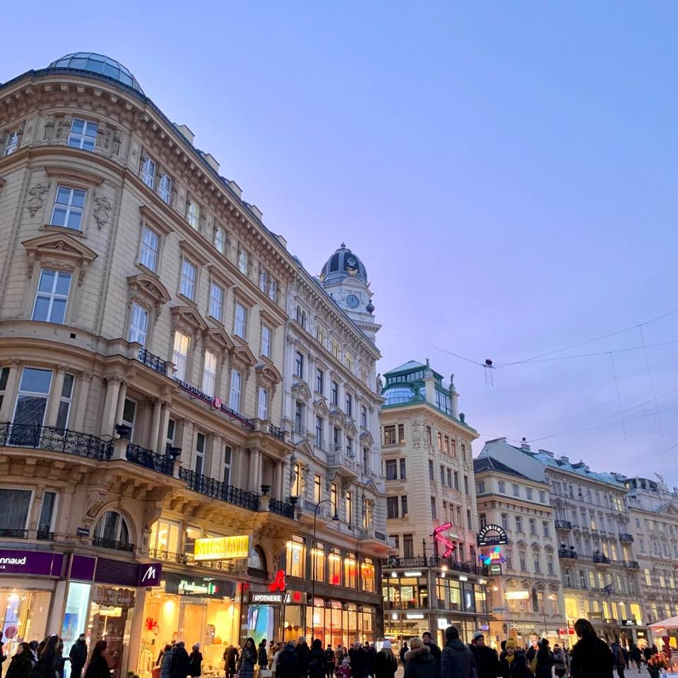 케이크도 음료도 다 새로운 맛이었다 쉬면서 자연사 박물관에 간 친구에게 연락했는데 아직도 박물관 관람 중이라고 해서 아까 슈테판 대성당 주변 번화가를 다시 가보기로 했다 카페에서 나오니 해 질 녘의 하늘이 너무 아름다웠다