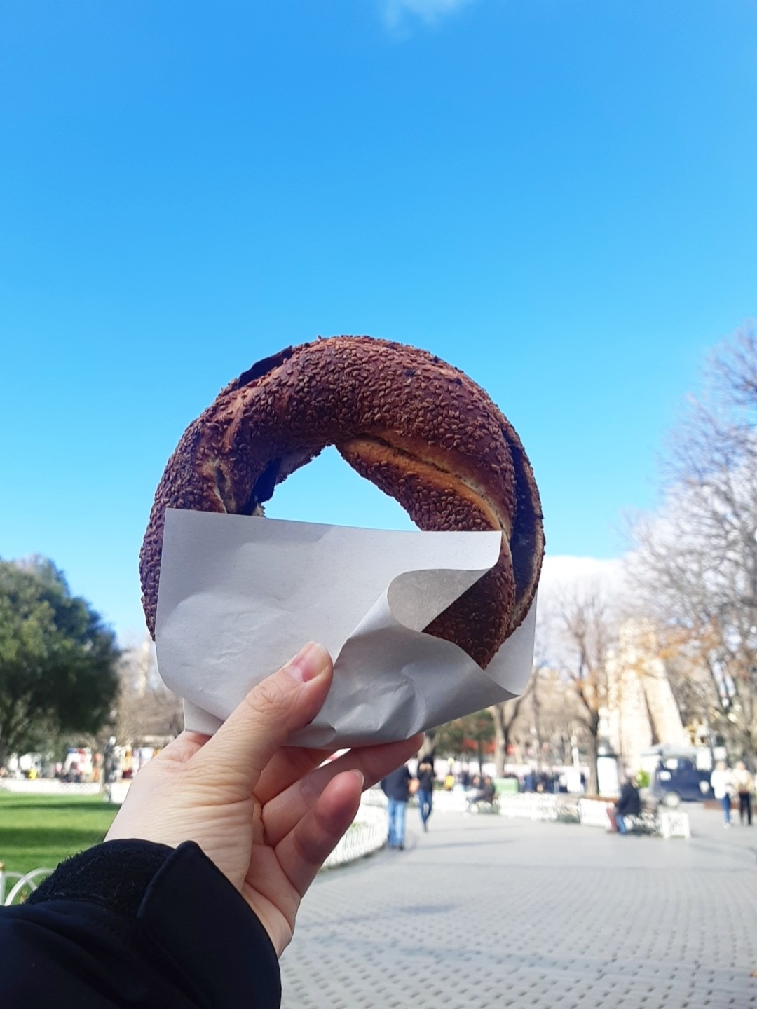 친구가 가장 보고 싶어 했던 블루모스크는 아쉽게도 공사 중이라 들어갈 수 없었다 다음 장소를 정하기 위해 잠시 벤치에 앉아 쉬는데 주변에 빵과 옥수수 등을 파는 수레가 많이 보였다 튀르키예의 주식은 빵과 옥수수 등이었고 그래서 수레마다 다 똑같이 팔고 있었던 것이다 사람들이 들고 가는 것을 보고 맛있어 보여 나도 하나 구입해 보았다 겉에는 바삭하고 깨 같은 게 붙어있었고 속에는 뉴텔라가 발려 맛있었다