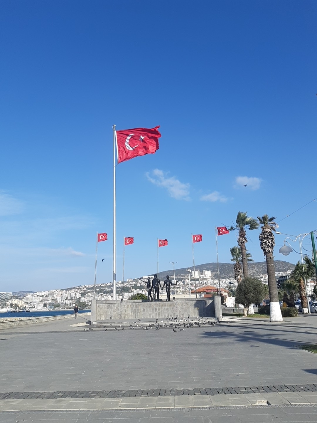 바다 쪽 광장으로 더 나아가 보았다 튀르키예임을 알리는 국기를 군데군데에서 볼 수 있었고 휴양도시 하면 떠오르는 야자수도 볼 수 있었다 모든 것이 완벽하여 아름다운 풍경을 보여주기 위해 또 가족과 친구들에게 영상통화를 걸었다