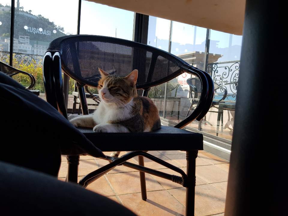 바다를 가장 잘 볼 수 있는 카페가 어디인지 알아봤는데 바로 바닷가 앞에 스타벅스가 위치해 있었고 사람도 많이 없어 그곳에 들어가 쿠샤다시의 바다를 만끽했다 바다색깔이 정말 에메랄드 빛이었으며 햇빛에 비춰 아름다움이 한껏 더 빛났다 친구와 구경하는데 몇 없는 손님들 중 한 분이 의자 사진을 찍으시길래 보았더니 고양이가 추위를 피해 들어와 쉬고 있는 것이었다