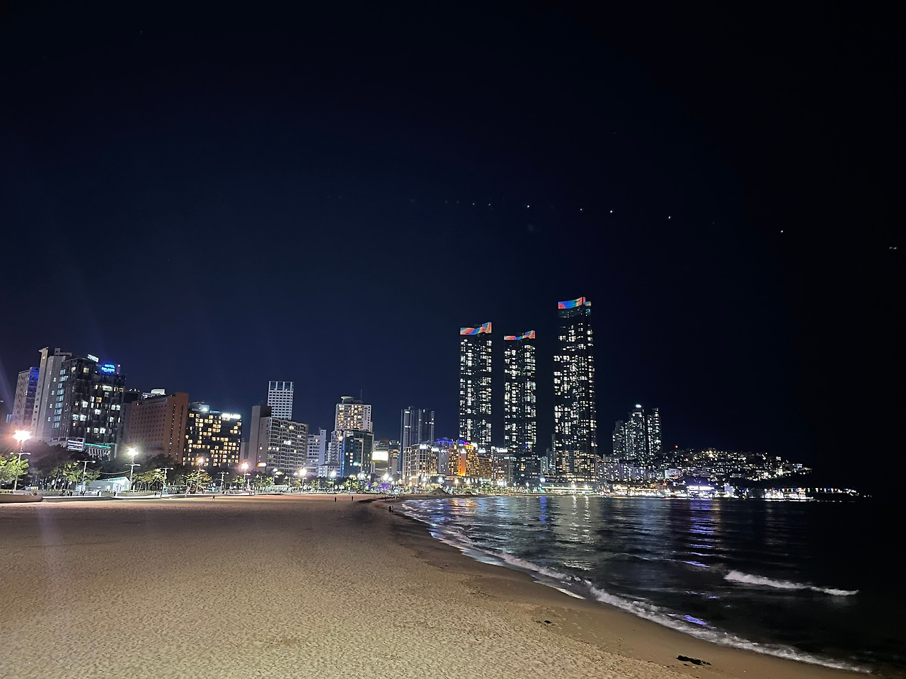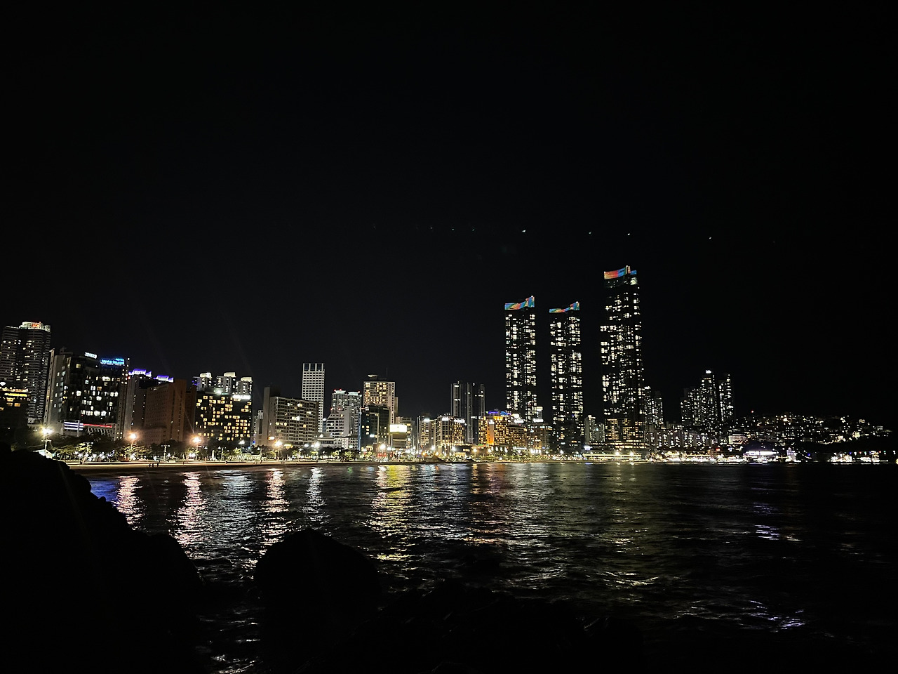 더베이 101에서 길 따라 해운대의 밤을 보러 향했다 어두워서 수평선은 안보였지만 주변에 많은 건물들에서 나오는 빛들 덕분에 해변은 낮 못지않게 밝았다