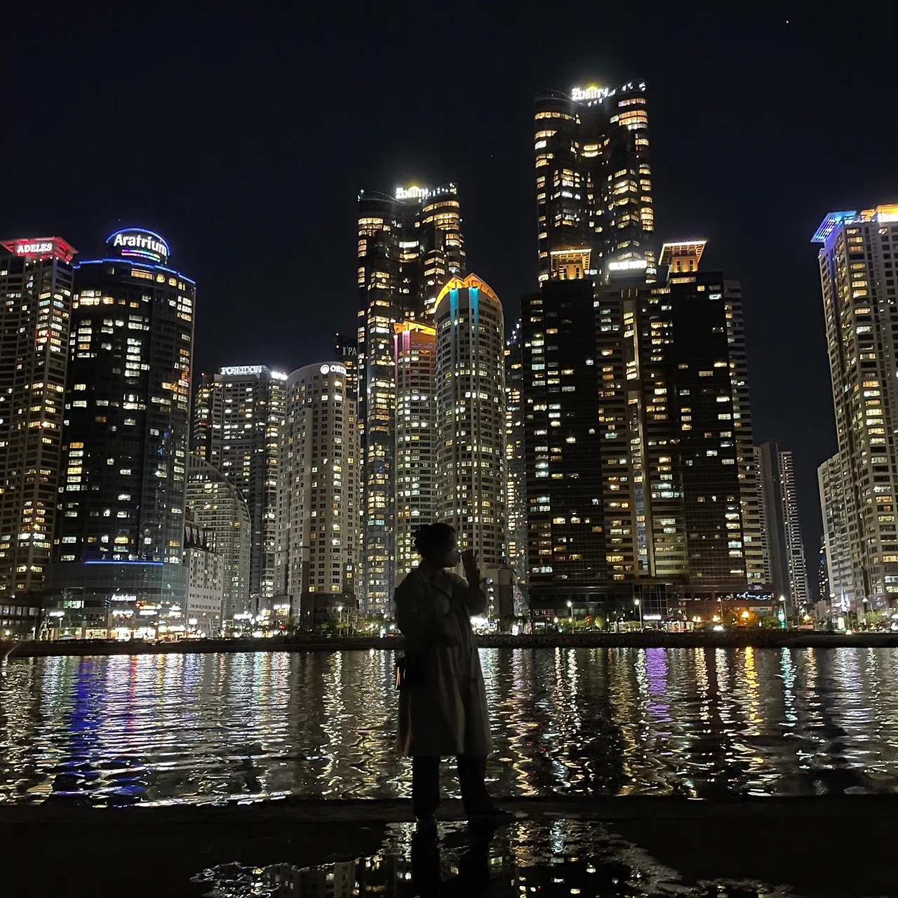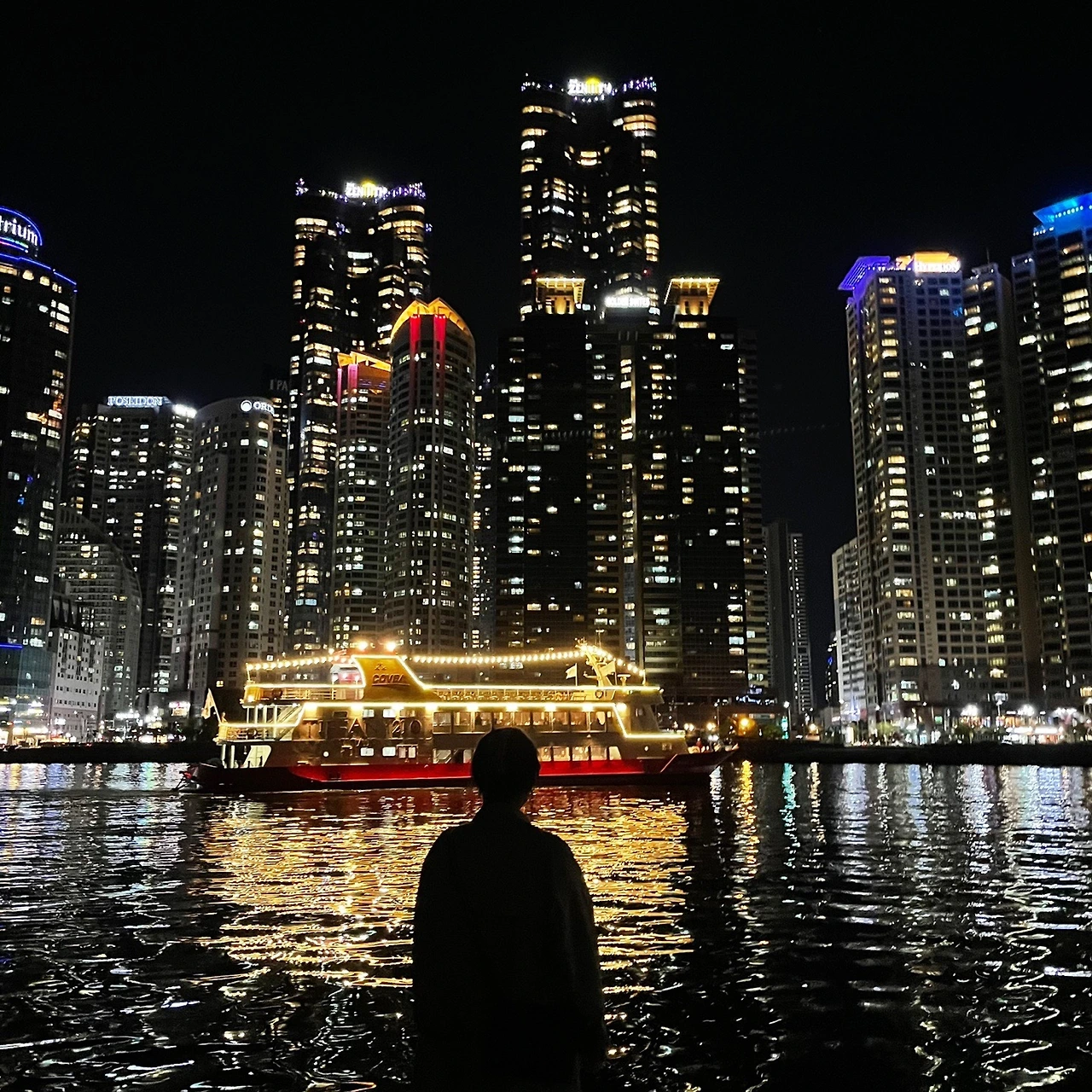 동백섬에 다다랐을 때는 그곳에 가기엔 너무 어두웠기에 간단하게 산책만 하고 야경사진으로 유명한 더베이 101로 갔다 물에 건물이 비치게 찍는 사진이 유명해서 그렇게 찍겠다며 위치를 찾았고 만족스러운 사진을 찍을 수 있었다 또 때마침 배도 지나가서 더 화려한 야경이었다