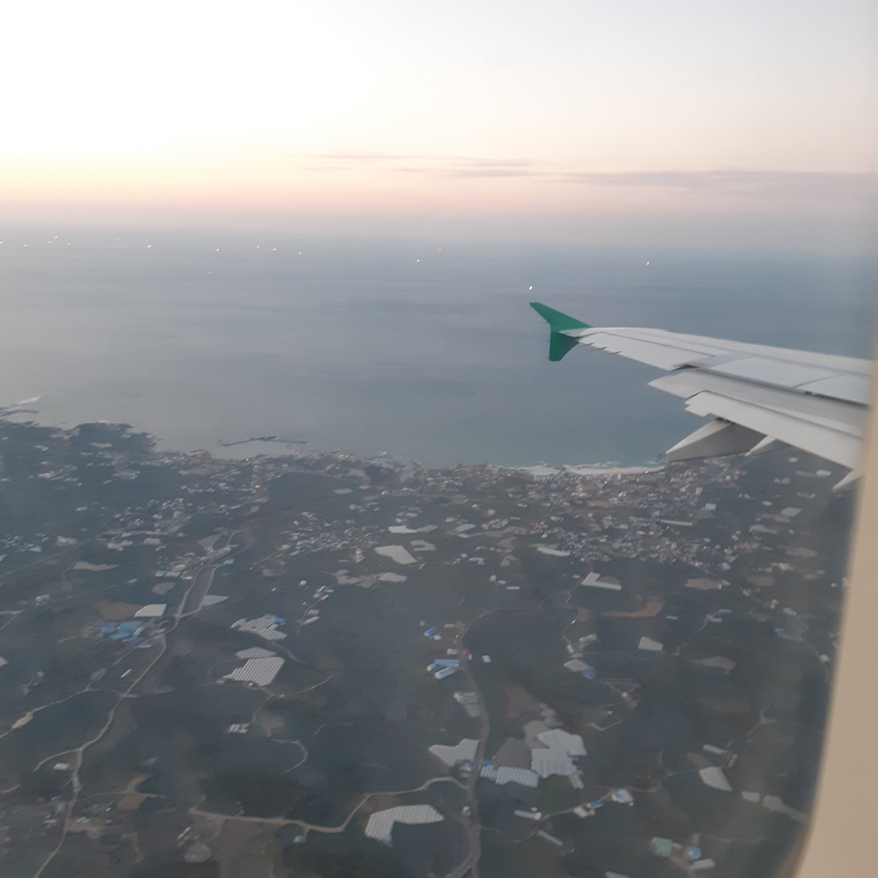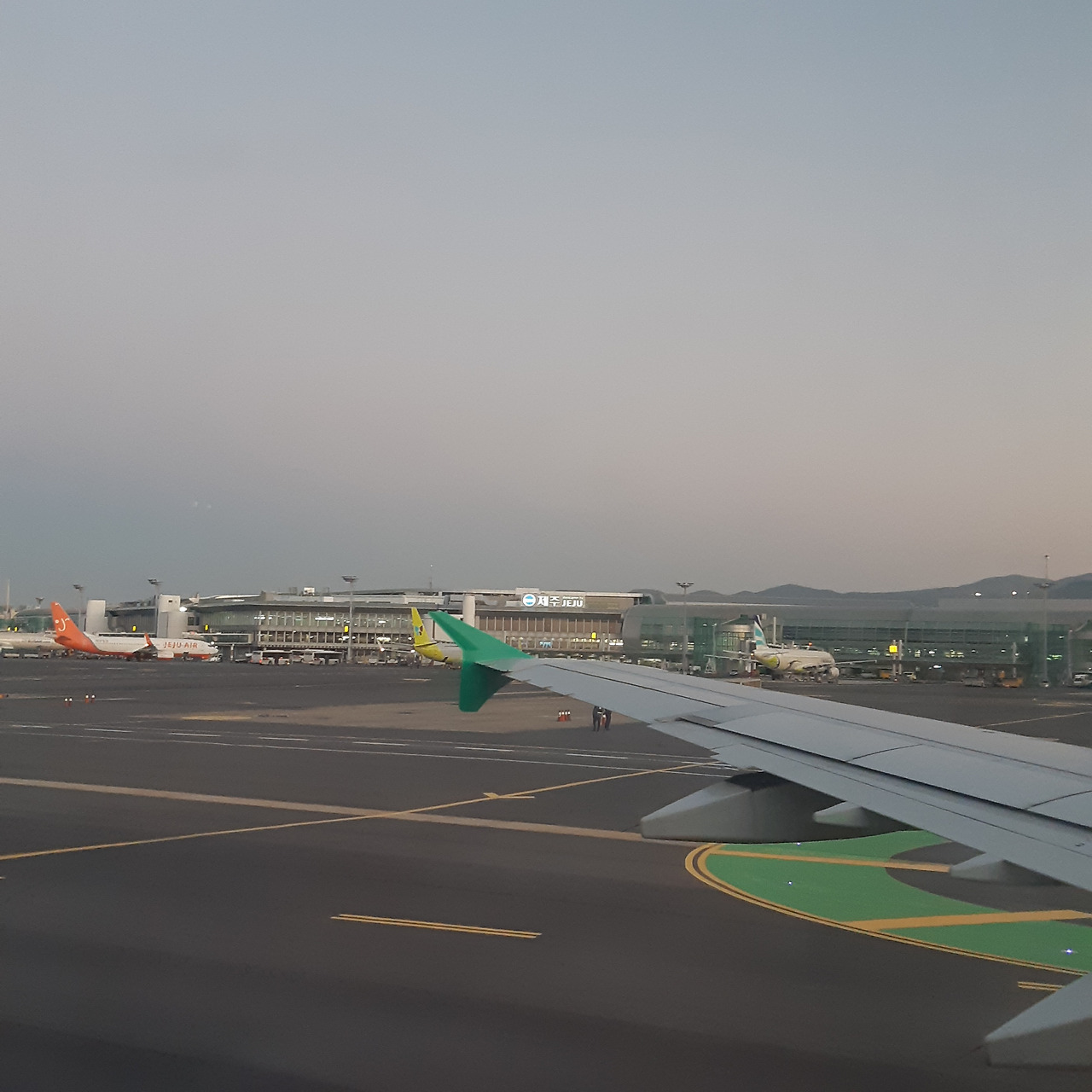 드디어 오른 비행기. 그리고 이륙. 나는 이 시간이 가장 설렌다 설레는 마음처럼 이륙할 때만 몸이 붕 뜨는 거 같음을 느낄 수 있기에 오랜만에 그 기분을 만끽할 수 있었다 제주도로 가는 시간은 약 1시간. 평소 같으면 길게만 느껴졌던 시간이 모두의 설레는 마음을 알았는지 눈 감았다 뜨니 벌써 제주도에 도착을 했다