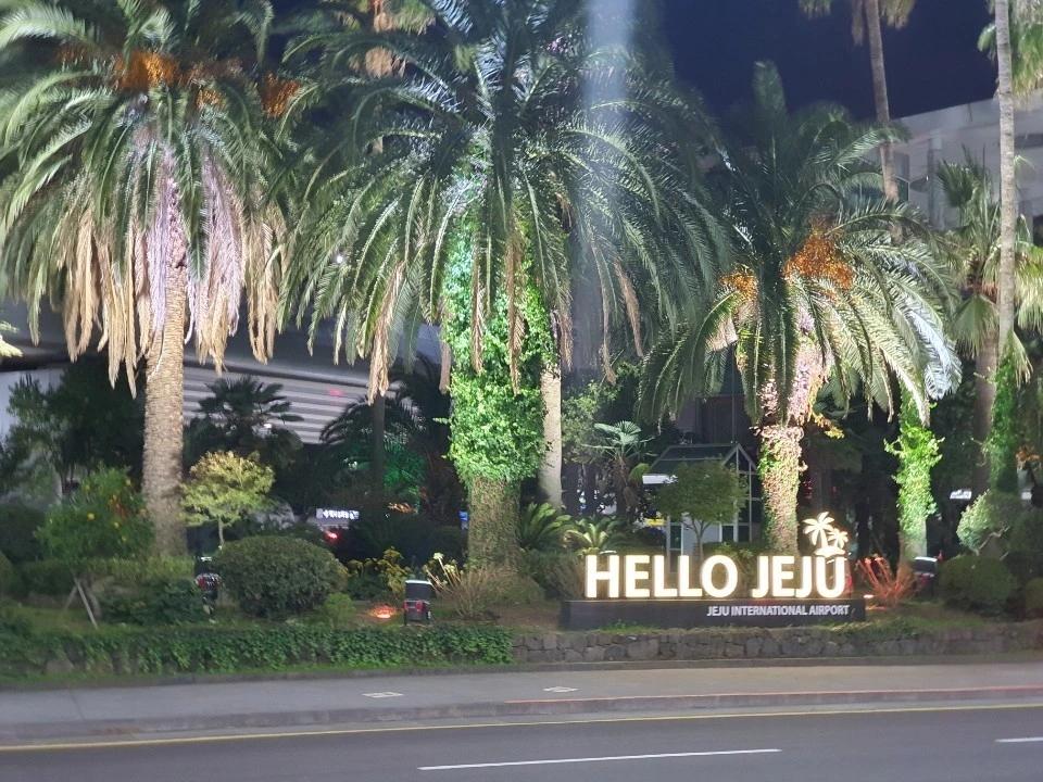 누가 봐도 제주도인 것을 알 수 있는 비행기 창밖 너머의 풍경. 내리자마자 마주한 제주의 공기는 정말 맑았다 무엇보다 공항에서 딱 나왔을 때 바로 보이는 야자수가 제주에 온 것을 실감 나게 해 주었고 HELLO JEJU라는 말이 들뜬 모두를 반겨주고 있었다