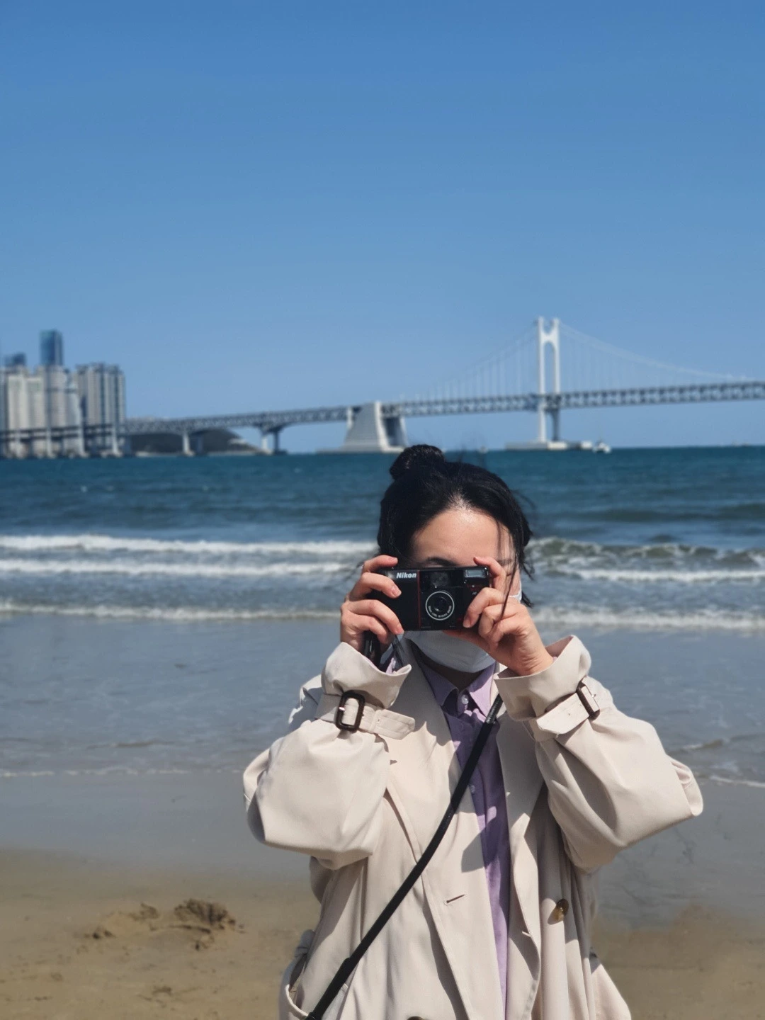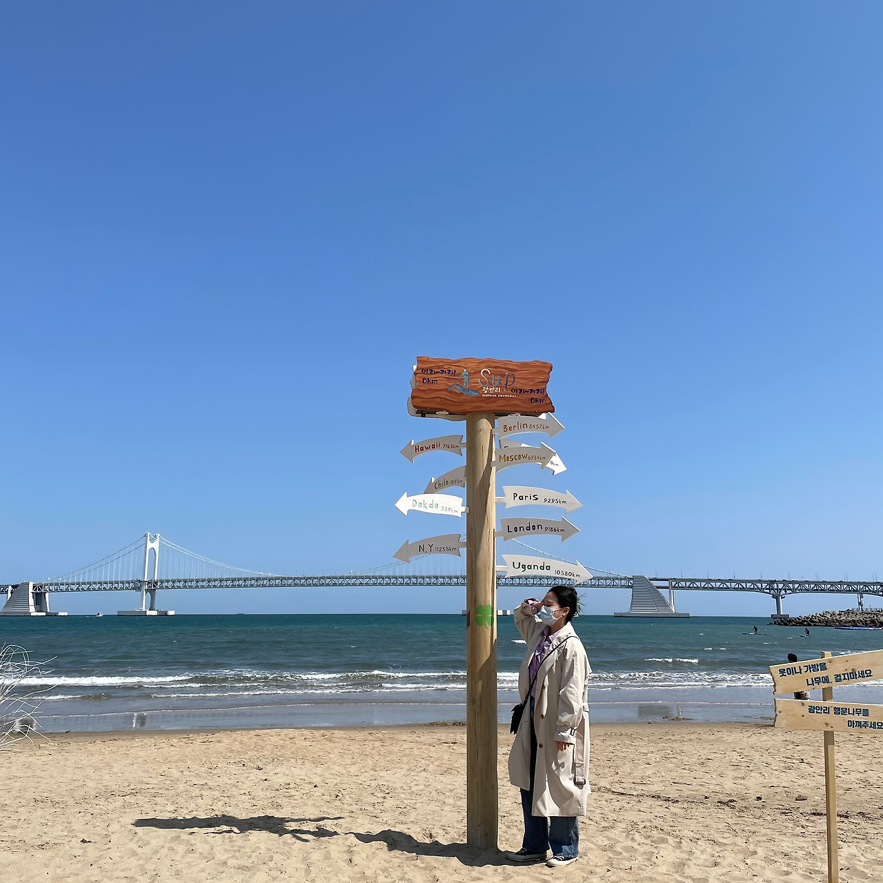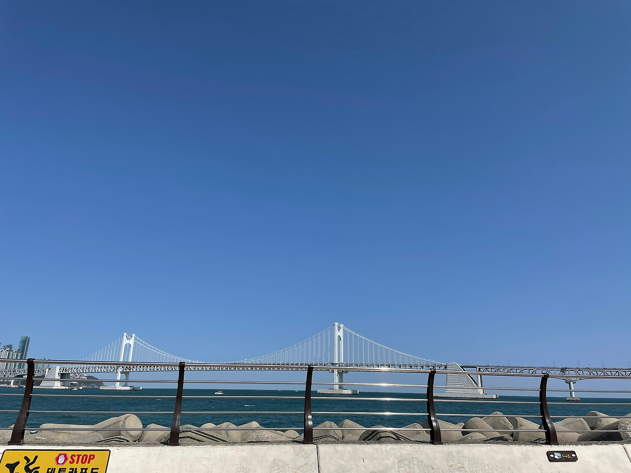 첫 번째, 친구와 사진 찍기! 광안대교를 배경으로 사진을 찍으며 부산의 화창한 오후를 즐겼다