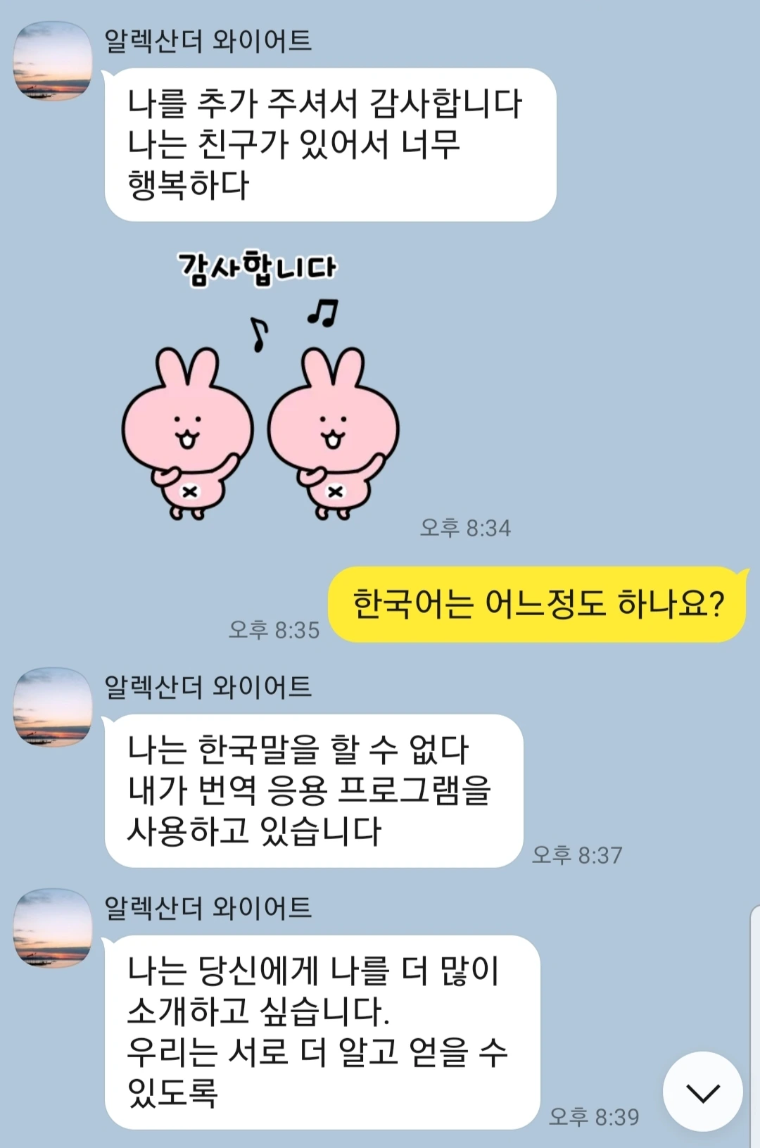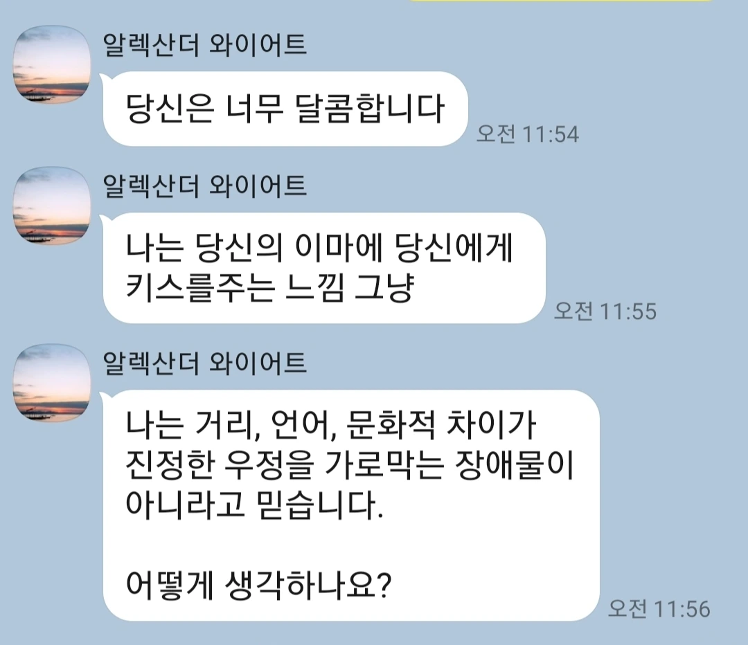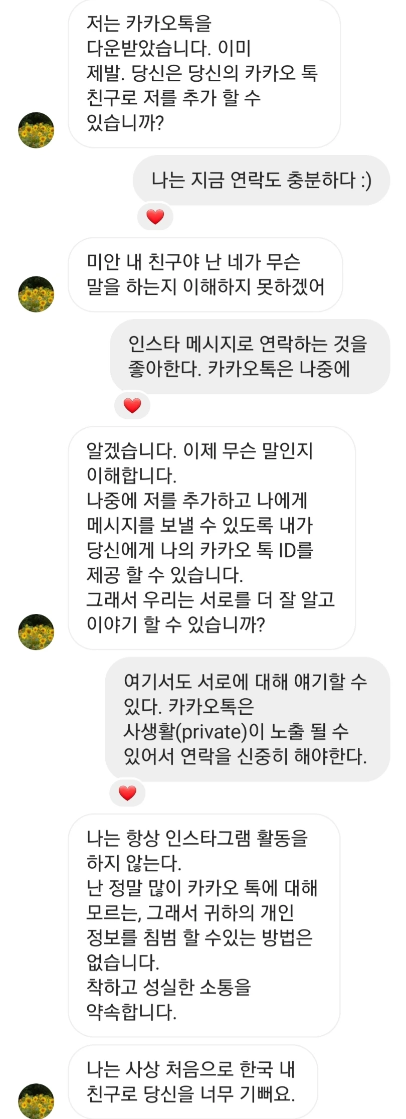 카카오톡으로 넘어간 후 한국에 관심 있다고 열심히 어필을 했다. 그때까지만 해도 정말로 한국에 관심 있어하는 외국인이구나 했다.