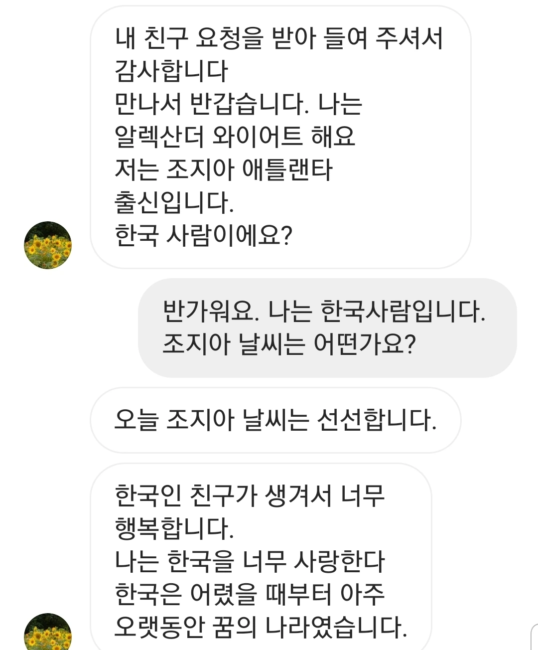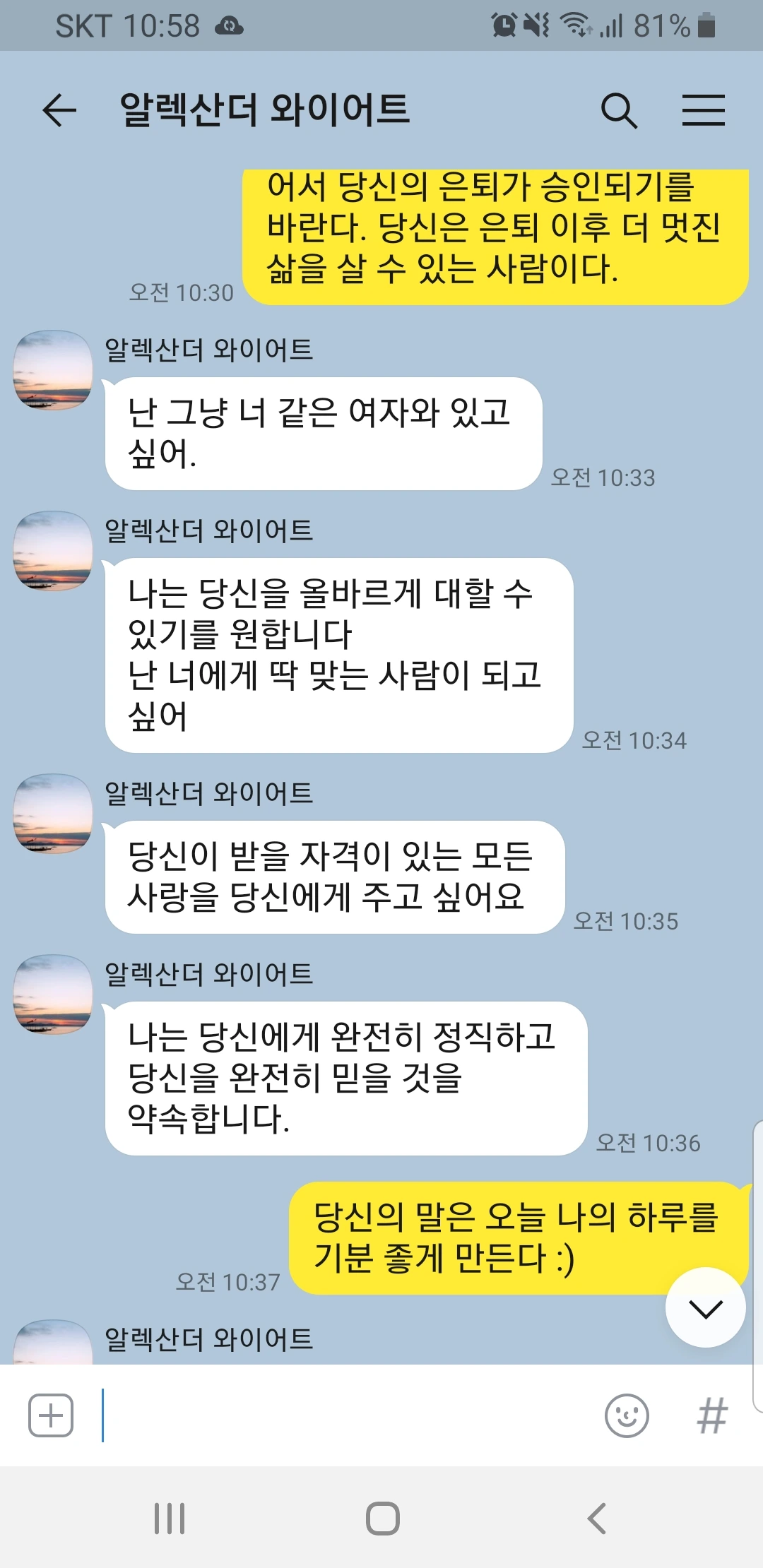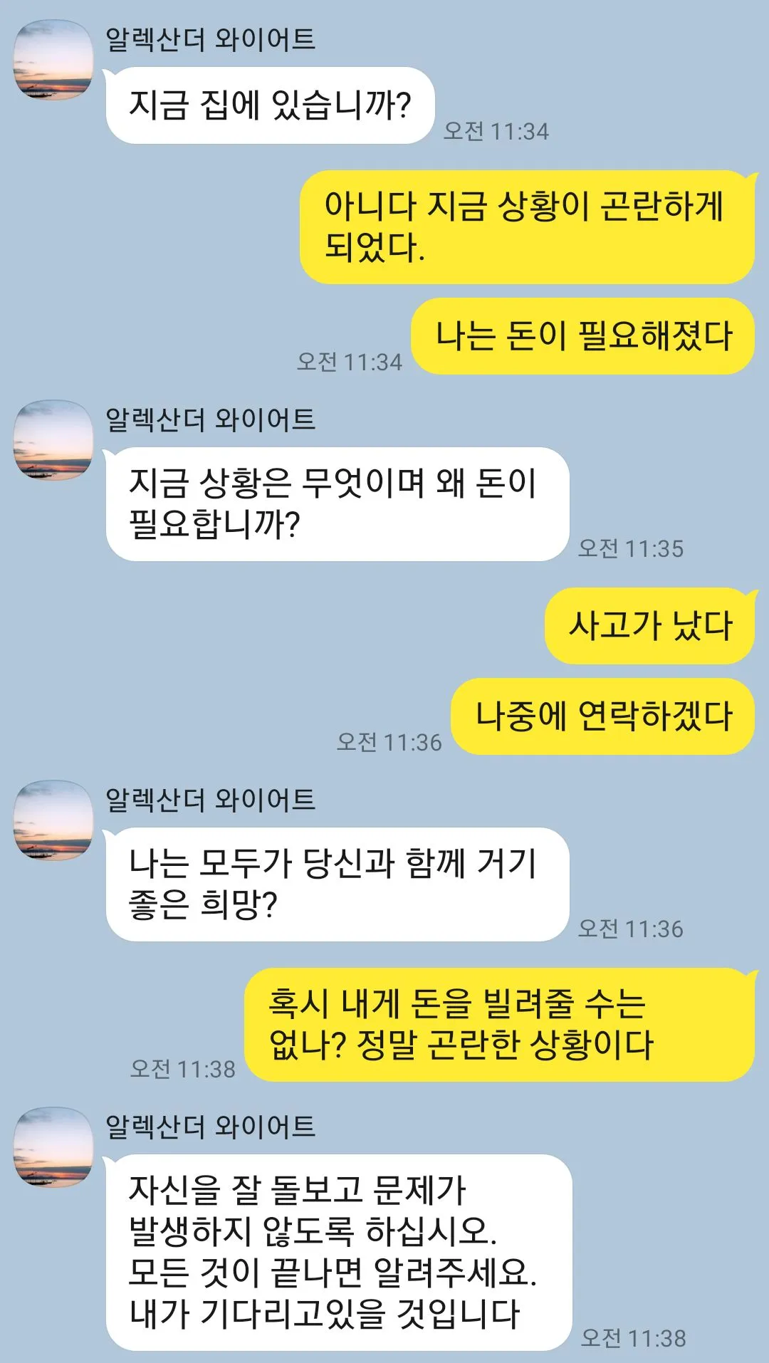 카카오톡으로 넘어간 후 한국에 관심 있다고 열심히 어필을 했다. 그때까지만 해도 정말로 한국에 관심 있어하는 외국인이구나 했다.