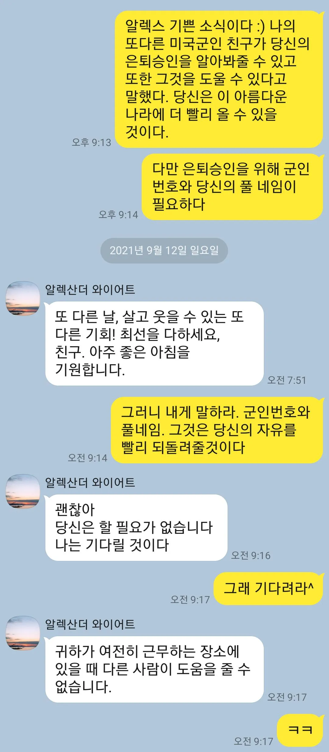 2. 신분증, 훈련 사진 등 사진을 보내며 믿도록 유도