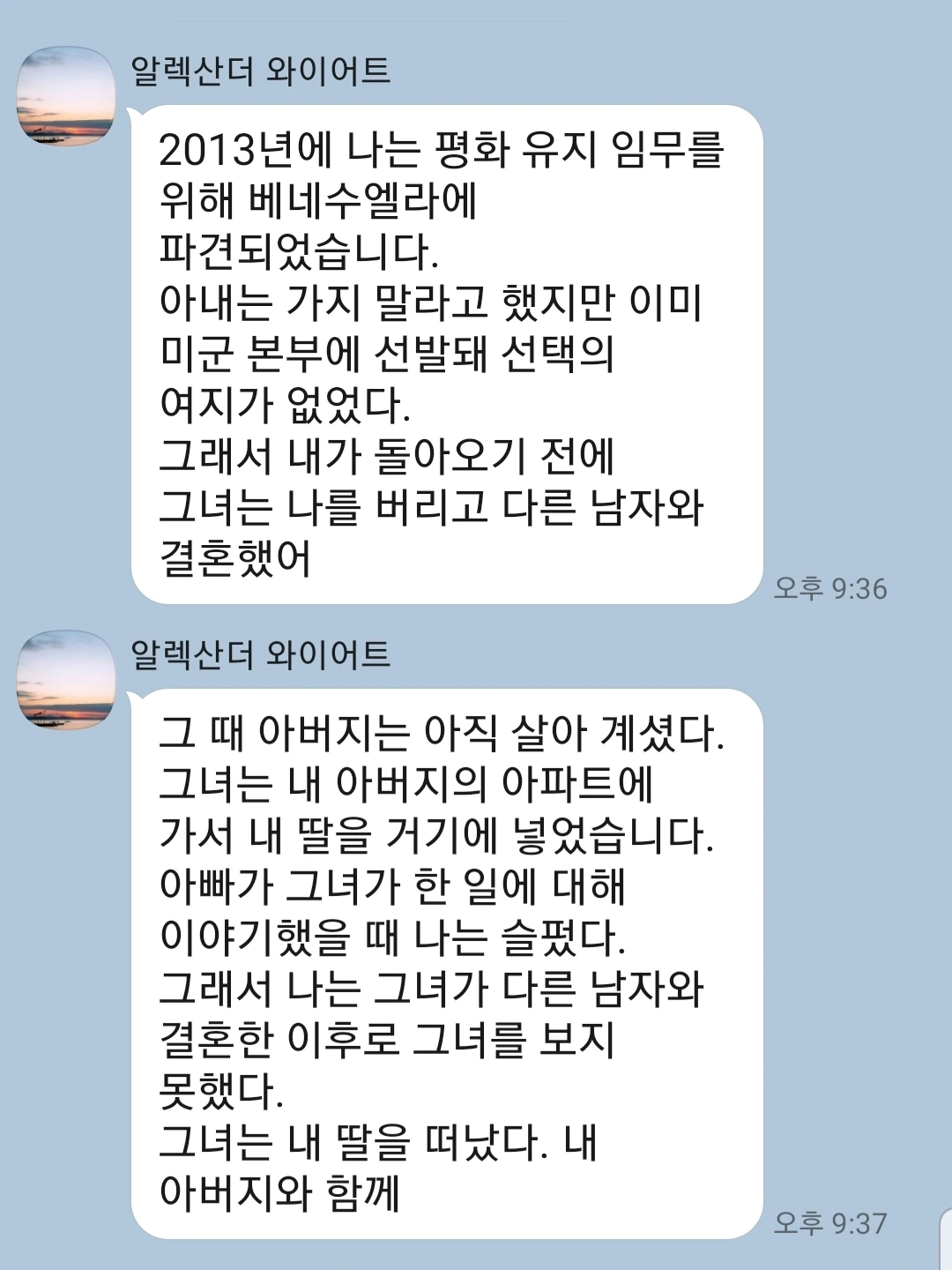 갑자기 테러가 났다며 연락이 없어진 그였다. 나는 정말로 기지에 테러가 일어난 줄 알고 걱정되긴 했다. 그런다 다음날 그는 아무 일 없던 것처럼 좋은 아침이라는 말과 함께 동료가 죽었다는 말을 아무렇지 않게 전해왔다. 그 순간 느껴지는 싸한 촉(대부분은 이 느낌이 들어맞았다)이 온 순간부터 의문이 들었다.