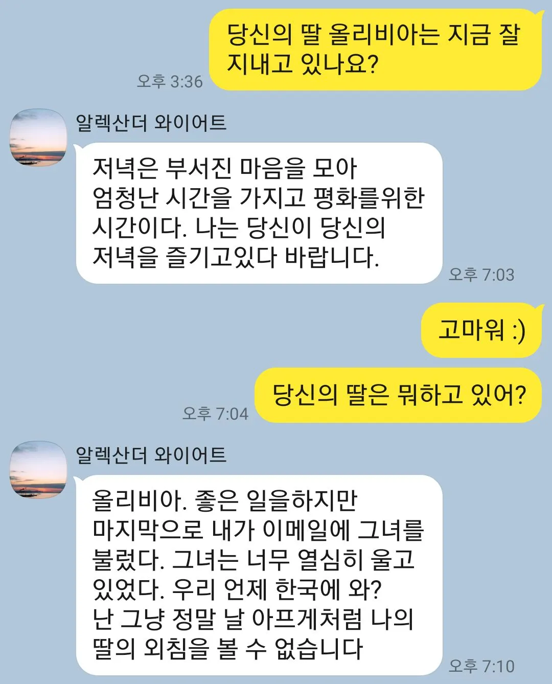 처음에 딸 이름이 사라였는데 '올리비아 잘 지내?'라고 물으니 잘 지낸다고 답했다. 그래서 여러 글을 찾아보니,