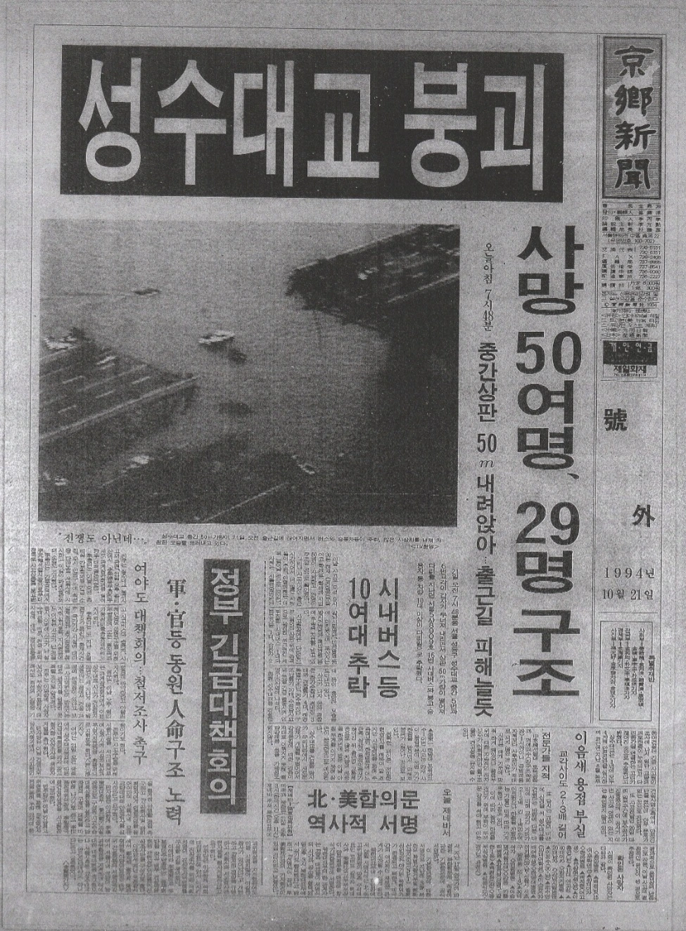 1994년 10월 21일 자 신문지에 박힌, 허리가 뜯겨 나간 다리의 흑백 사진은 볼수록 기괴하다. 거리에는 김건모의 레게 리듬이 신나게 울려 퍼지고 '1인당 GDP 1만 달러 돌파'라는 뉴스들이 쏟아졌지만, 나에게 이 세상은 그저 무너져 내린 '붕괴의 시대'일 뿐이었다. 오전 7시 38분, 평범한 등굣길의 여고생들과 서둘러 버스에 올랐던 출근길 직장인들이 차디찬 한강 물속으로 고꾸라졌다. 신문 지면을 가득 채운 '부실'과 '방치'라는 단어들은 어른들의 비겁하고 무책임한 자화상을 그렸다. 그들이 쌓아 올린 탐욕 아래 아무 죄 없는 우리 이웃의 여린 숨결이 끊어졌다.