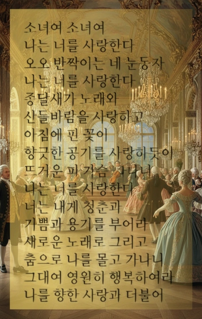 괴테의 시구처럼, 세상은 나뭇가지마다 피어나는 너라는 꽃으로 가득하다. 종달새가 노래와 산들바람을, 꽃이 향긋한 공기를 사랑하듯이 나의 세계는 오직 너로 채워진다. 반짝이는 네 눈동자 앞에 뜨거운 피는 고동치고, 너는 내게 청춘과 기쁨과 용기가 된다. 노래와 춤이 이끄는 이 눈부신 시절 속에서, 그대도 부디 영원히 행복하기를.