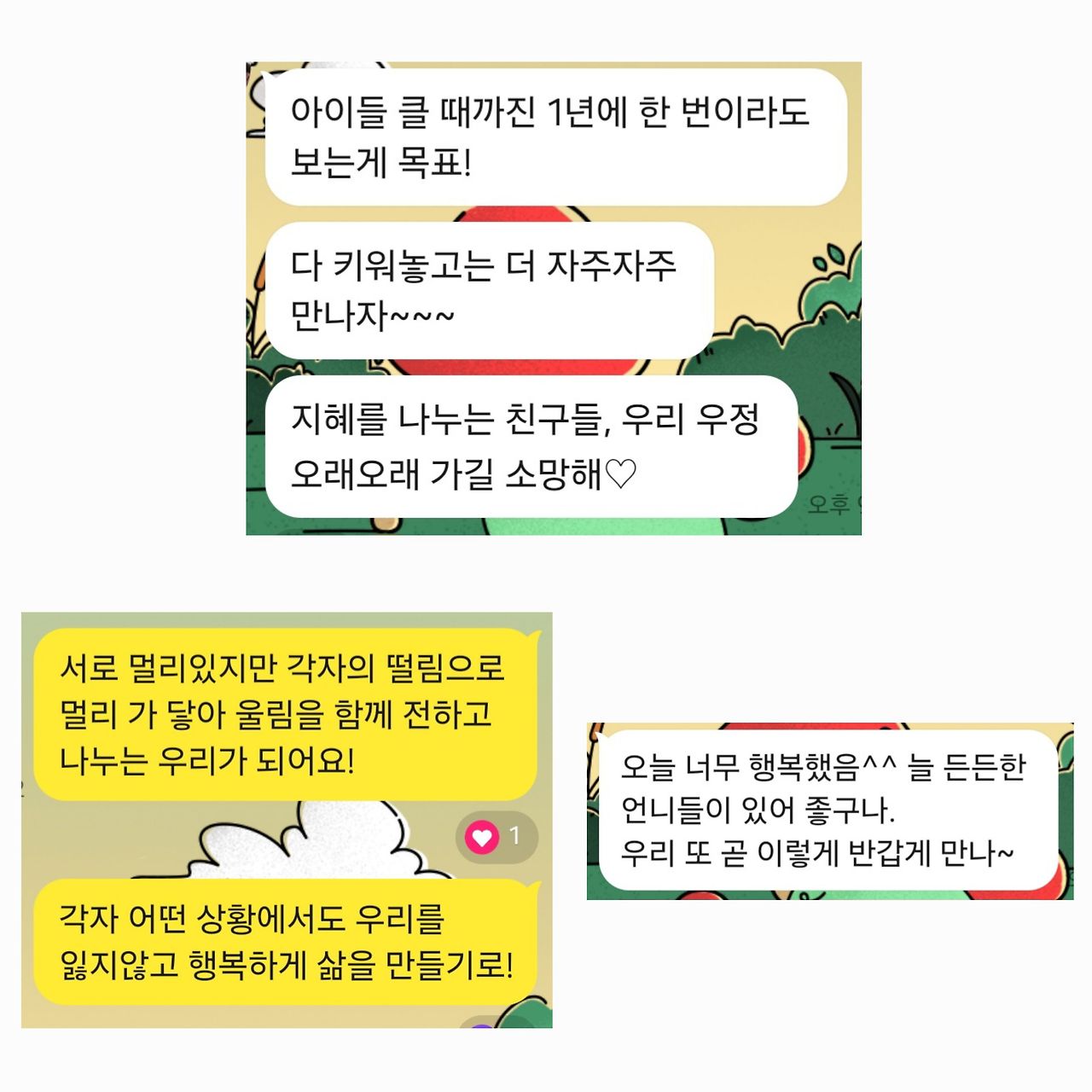 나눌수록 더 단단해지는 연결된 마음. 서로 인정해주고 힘이 되어주는 위로는 다음에 만날 마음 체력에 보태질 예정. 어느 날 보고싶으면 훌쩍 달려갈 수 있는 다져진 마음.