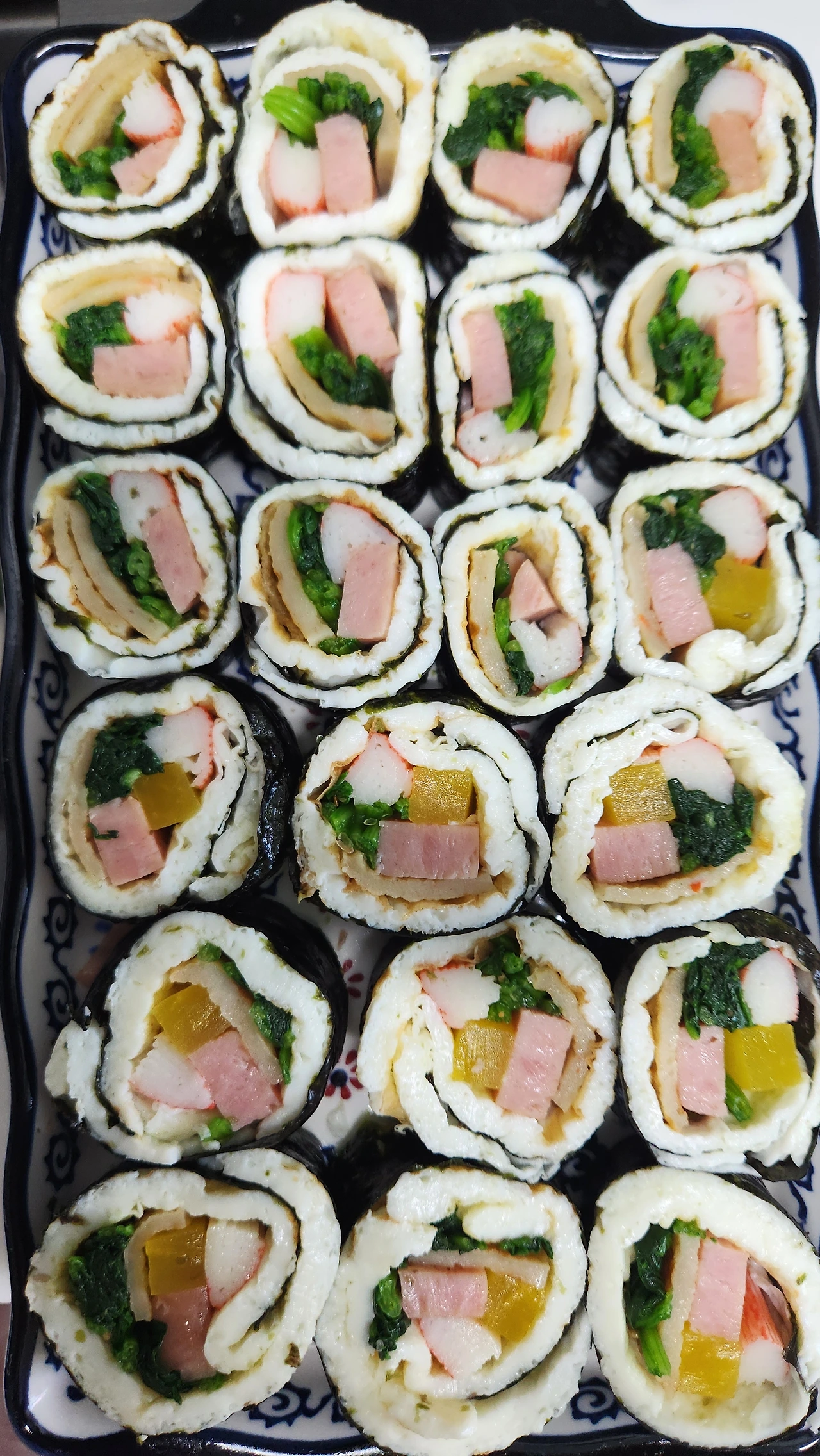 김에 하얀 보름달을 얹어 넣고, 시금치, 크래미, 어묵, 구운 파, 단무지를 넣고 둘둘 말아낸다. 밥을 넣지 않아도 멀리서 보면 흰색 계란이 밥처럼 제법 그럴싸하다. 난단백으로 계란을 두껍게 부쳐내길 잘했다. 감쪽같다. 먹으면 금세 탄로 날 맛이겠지만!