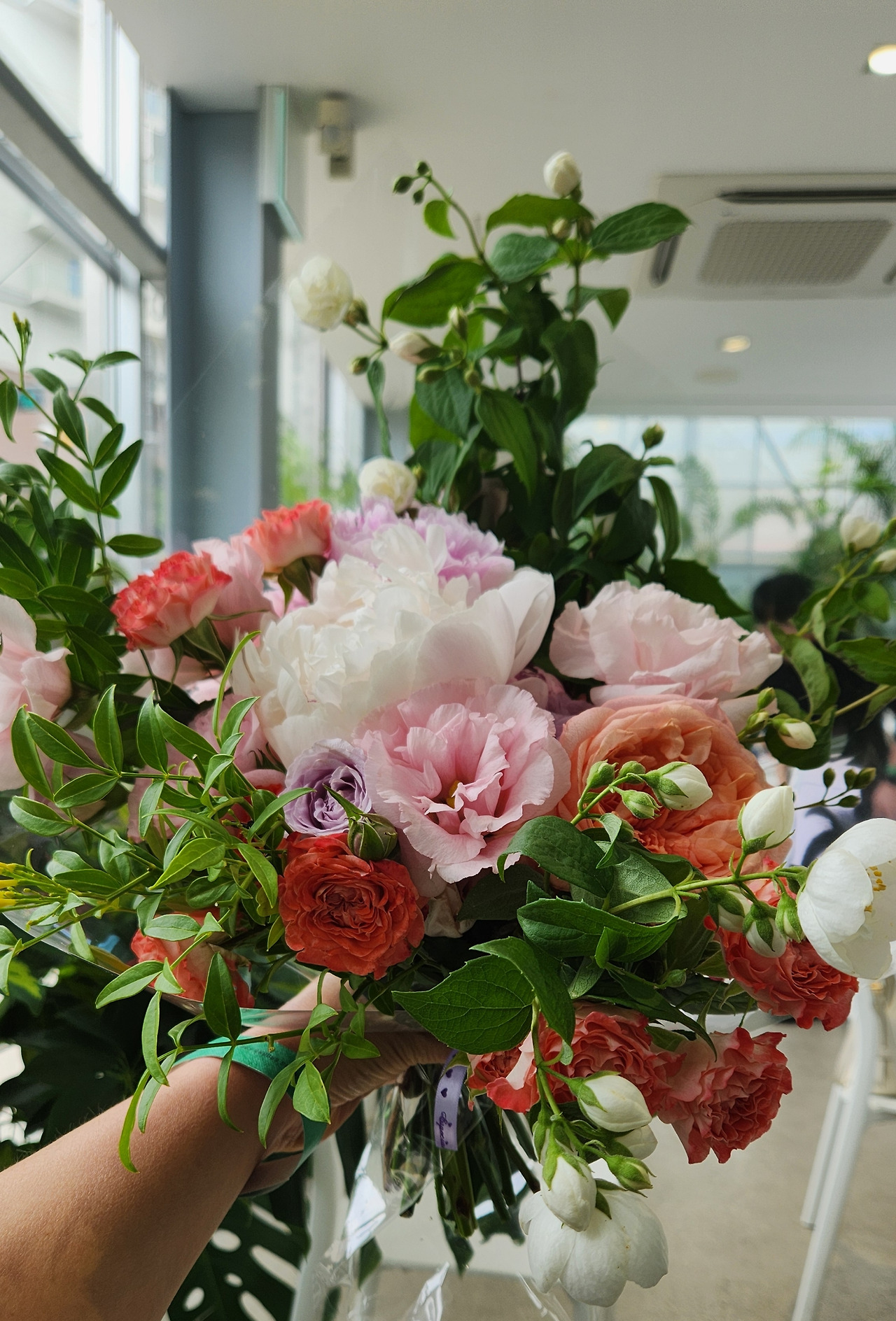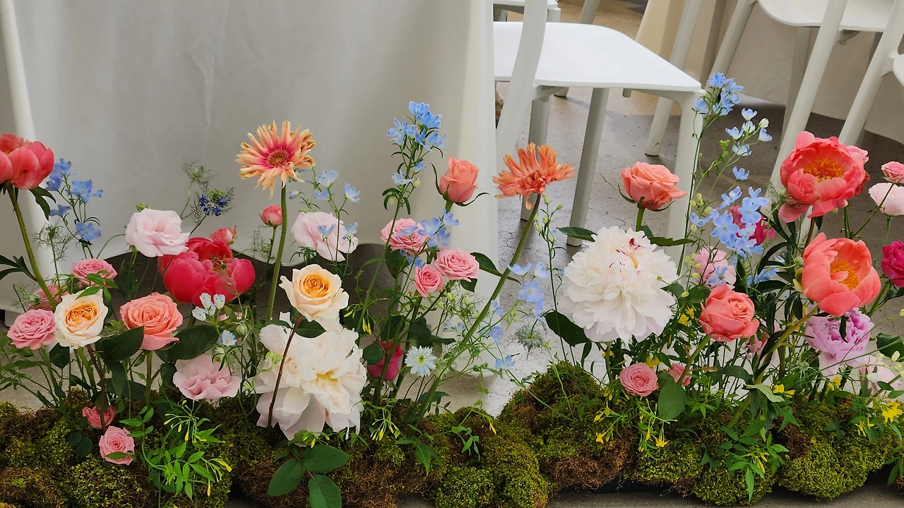 "꽃들고 함께 찍어요, 여기 보세요!"